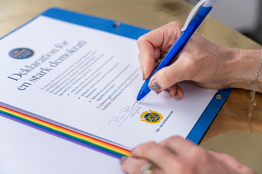 Pernilla Bonde, vd på HSB Riksförbund, signerar demokratideklarationen.