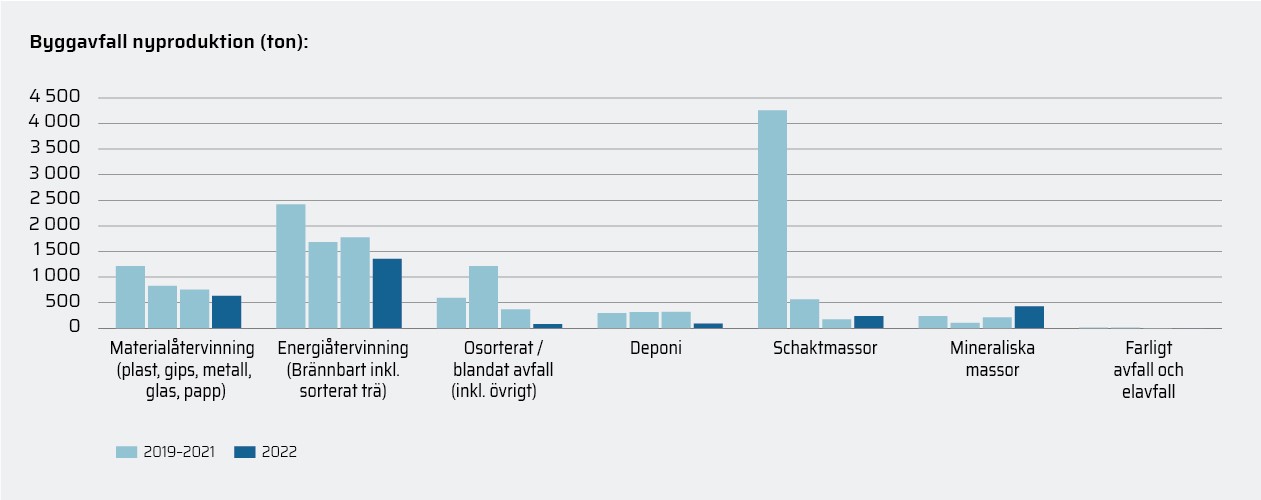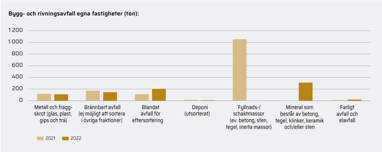 Minimering av byggavfall och omställning till ett cirkulärt byggande med återbruk och återvinning är en förutsättning för ett verkligt effektivt och ansvarsfullt utnyttjande av resurser. HSB arbetar för att mängden byggavfall ska minska och andelen sorterat avfall för materialåtervinning ska öka. Byggavfallet från renovering av HSBs egna fastigheter ökade under 2024, vilket beror på att fler regionföreningar rapporterat avfall från ROT-projekt jämfört med föregående år.