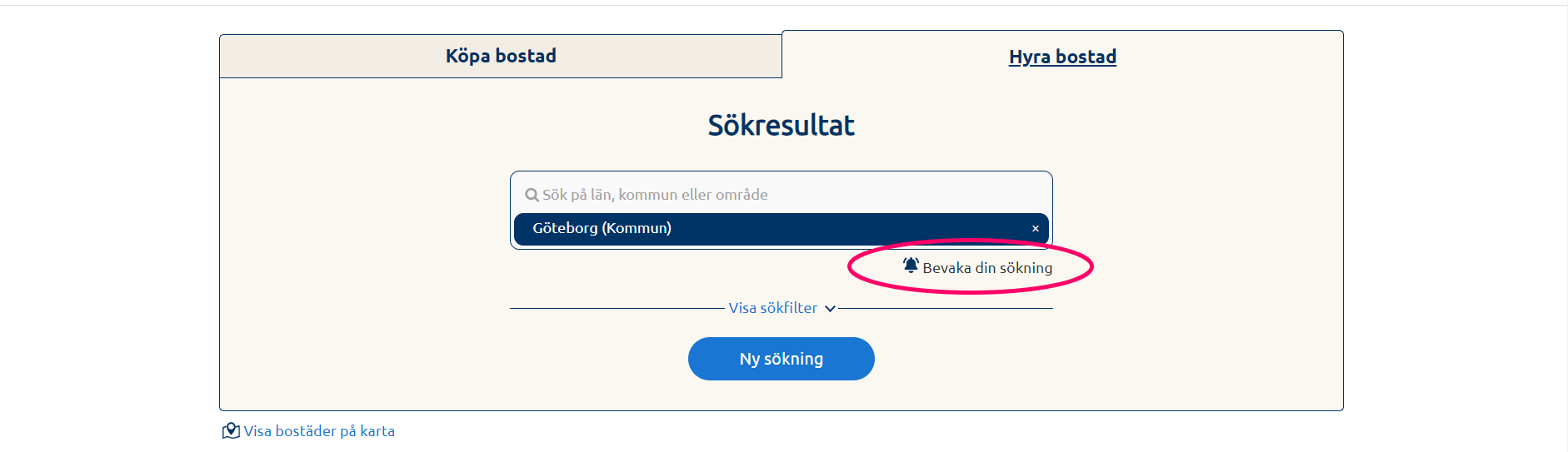• Oavsett om du får någon träff eller inte på sökningen så finns där en länk som heter "Bevaka din sökning". Tryck på länken.