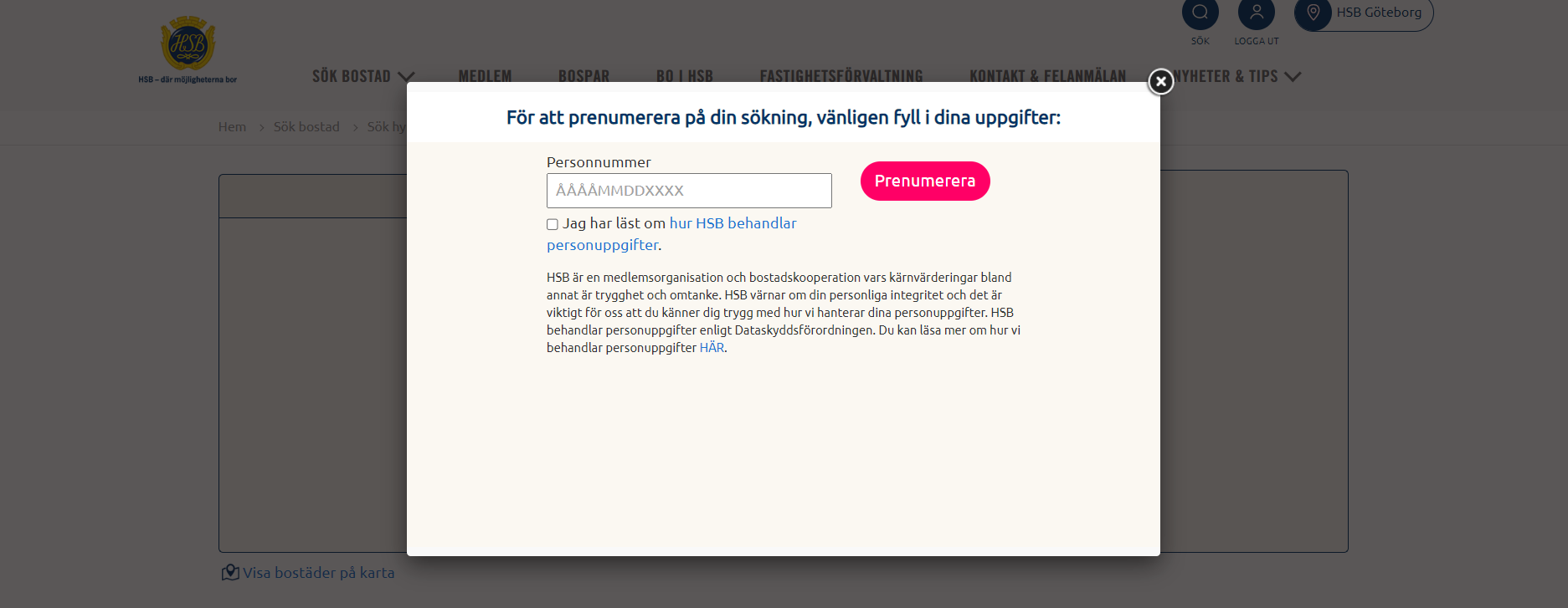 • Du anger sedan personnummer och behöver också kryssa i rutan om att du läst om hur HSB behandlar dina personuppgifter innan du trycker på "Prenumerera"