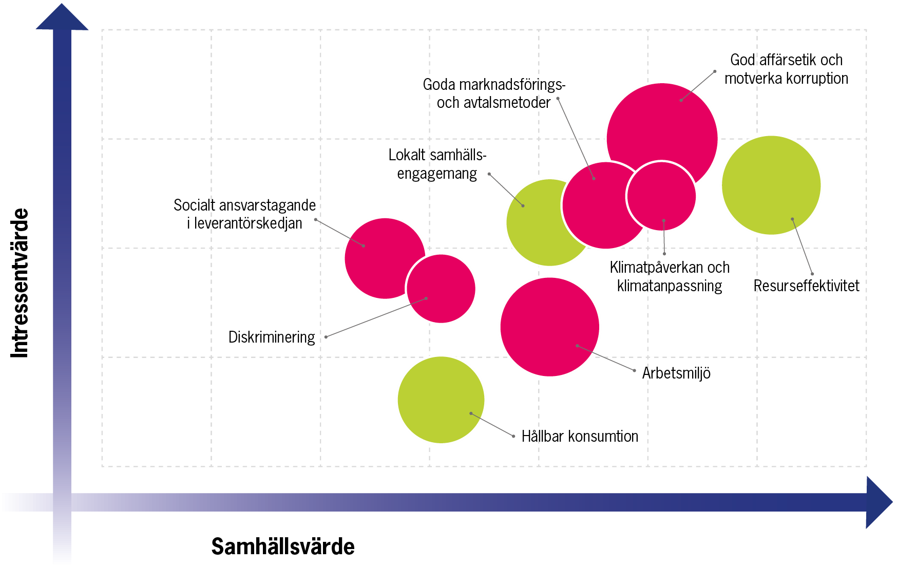En extern intressentgrupp bestående av leverantörer och partners har under 2017 kommenterat analysen vid fysiska möten, för att validera den interna bedömningen av intressentvärdet. Resultatet visar att områdena ”hållbar resursanvändning” och ”antikorruption” värderas som viktigast, vilket styrker den internt genomförda väsentlighetsanalysen. Samtliga nio prioriterade områden är utmärka i matrisen ovan. HSBs arbete med respektive område är beskrivet under HSBs strategiska fokusområden under Våra mål och progress.
