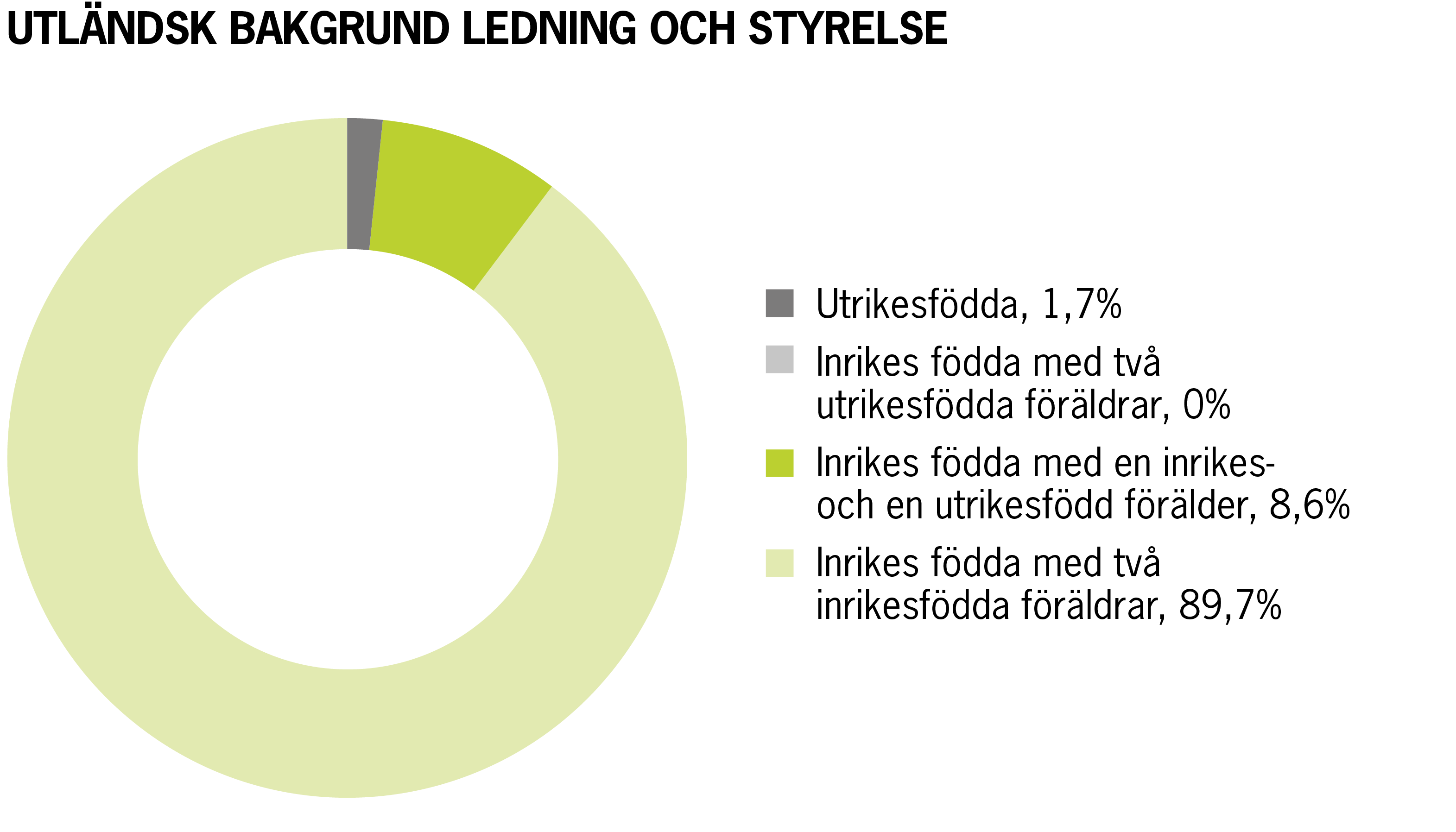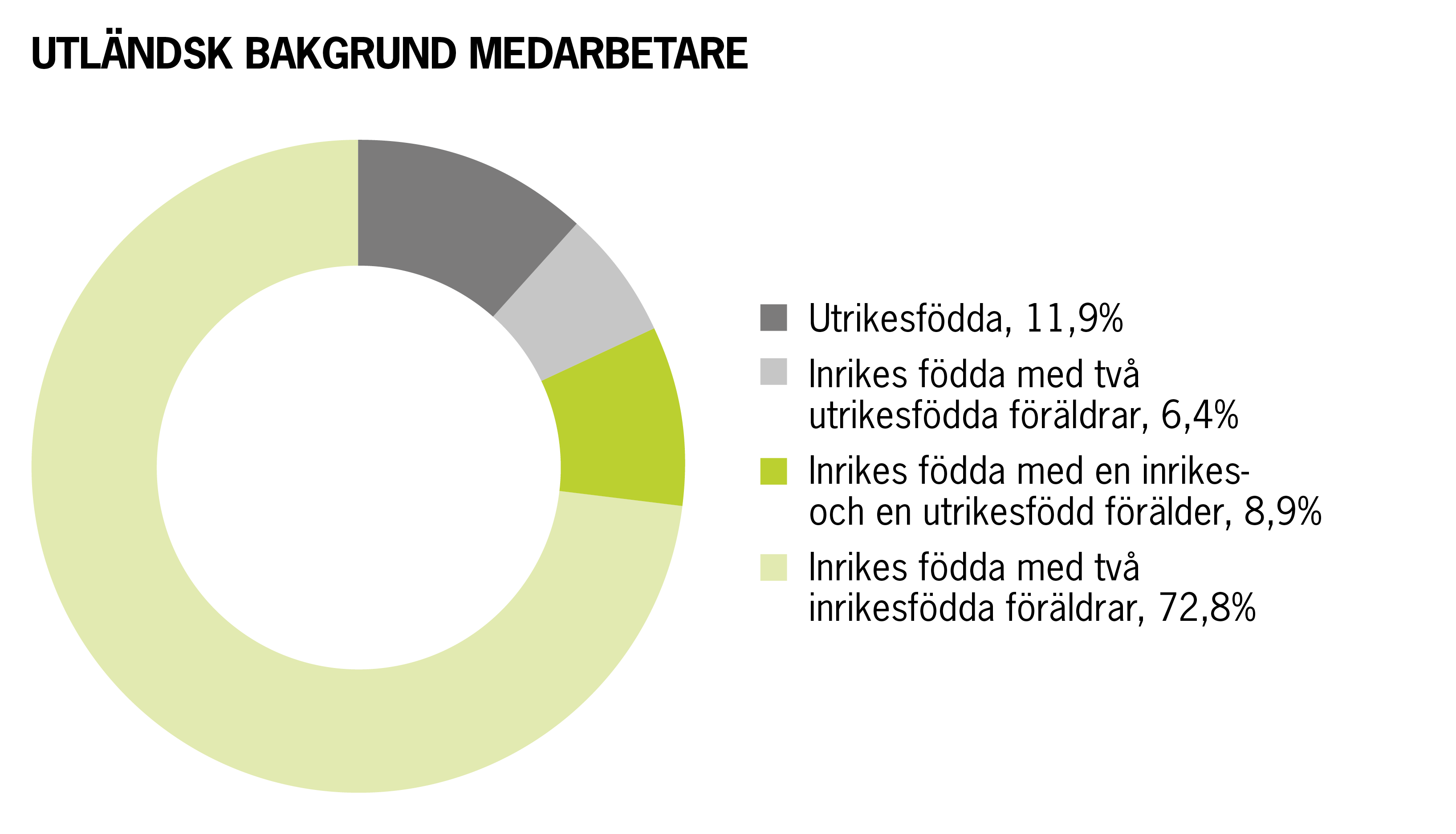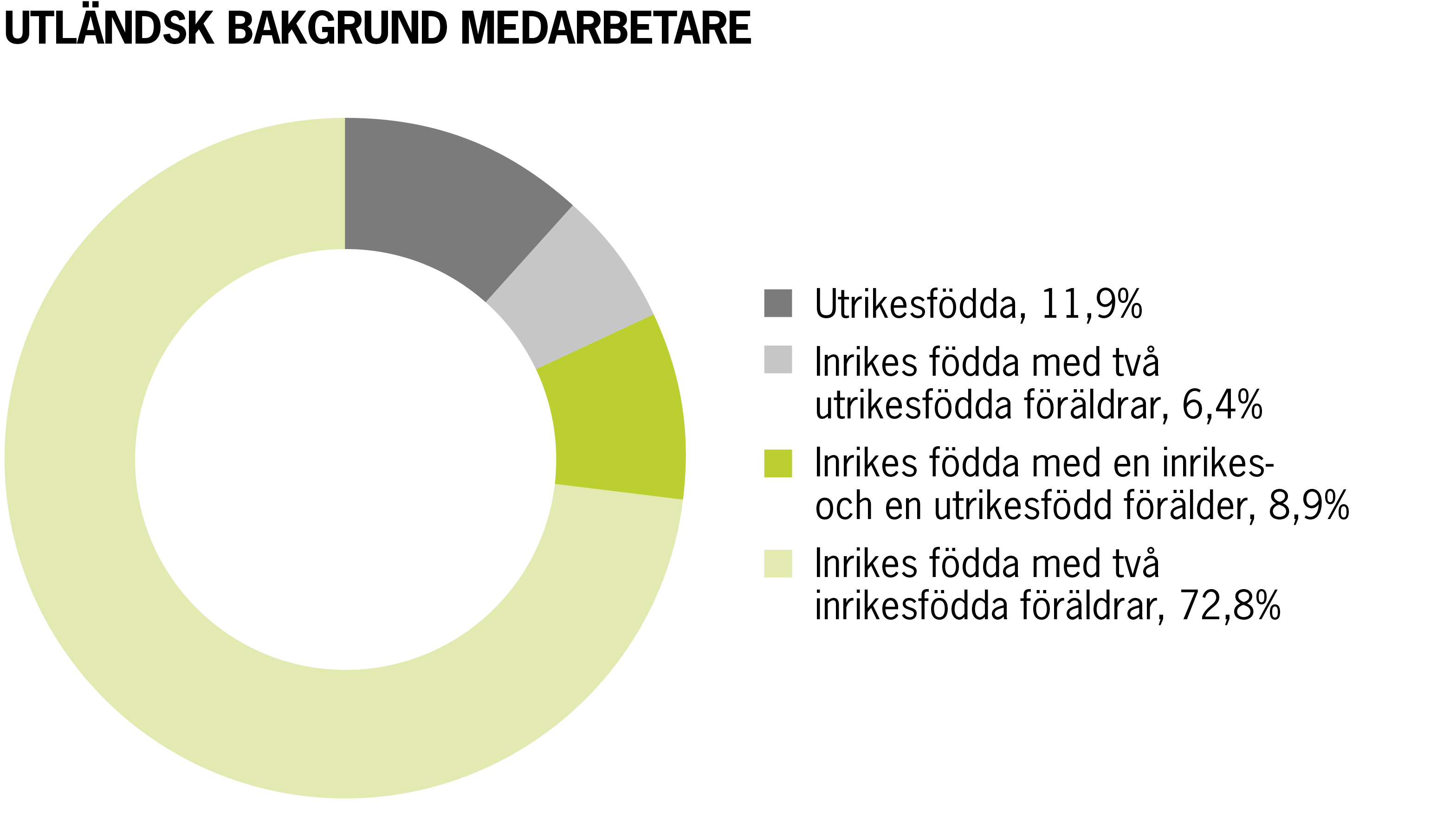 För att bidra till att öka mångfalden i samhället har vi som ambition att hela HSB från och med 2018 rapporterar antal med utländsk bakgrund i ledning, styrelse och bland medarbetare. Utländsk bakgrund är definierat som utrikes född eller inrikes född med två utrikes födda föräldrar och rapporteringen sker enligt Statistiska Centralbyråns metod för statistik över utländsk/svensk bakgrund. Tre regionala HSB-föreningar och bolag har rapporterat redan under 2017. Hos HSB Göta, HSB Projektpartner och HSB Stockholm har totalt 18,3 procent av medarbetare och 1,7 procent i ledning och styrelse utländsk bakgrund. Det kan jämföras med andelen folkbokförda mellan 20-64 år i Sverige med utländsk bakgrund, som enligt SCB var 27 procent under 2017 (andelen utrikes födda var 23 procent).