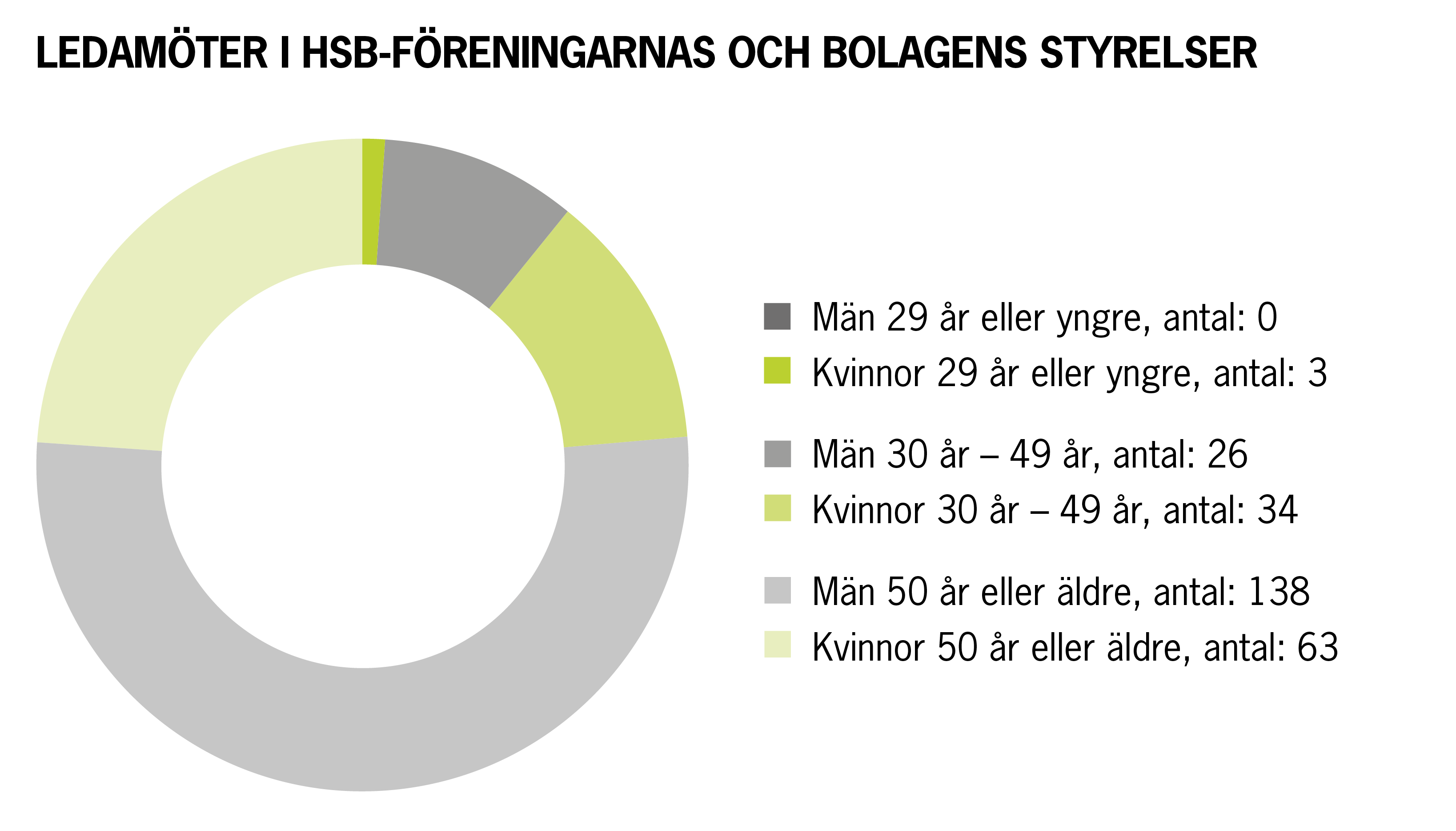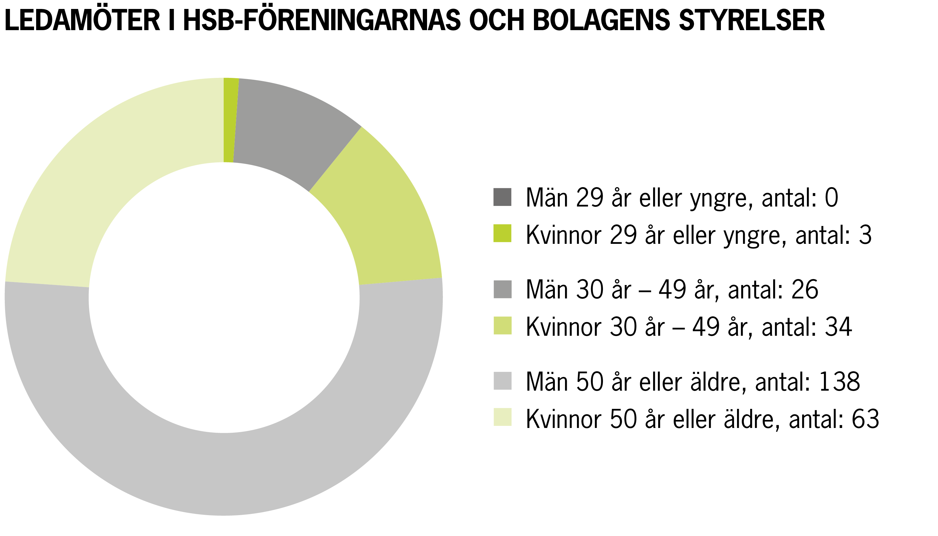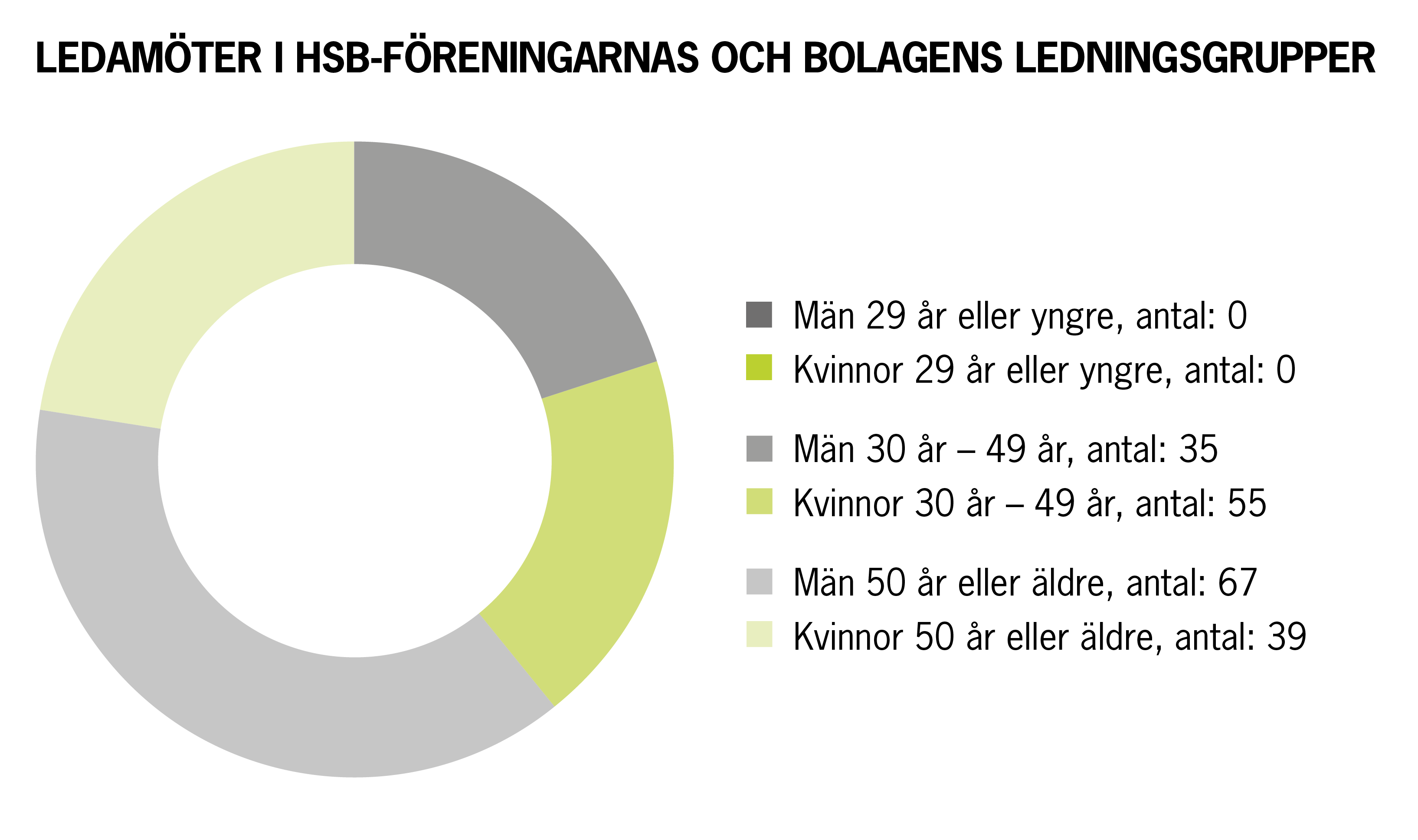 Könsfördelningen bland HSBs 3 379 medarbetare* var 58 (55) procent män och 42 (45) procent kvinnor under 2017. I ledningsgrupperna för regionala HSB-föreningar och bolag var 52 (52) procent män och 48 (48) procent kvinnor. 6 av 33 (4 av 32) vd:ar var kvinnor. I styrelserna för regionala HSB-föreningar och bolag var 62 (62) procent män och 38 (38) procent kvinnor. 10 av 33 (11 av 32) ordförande var kvinnor.