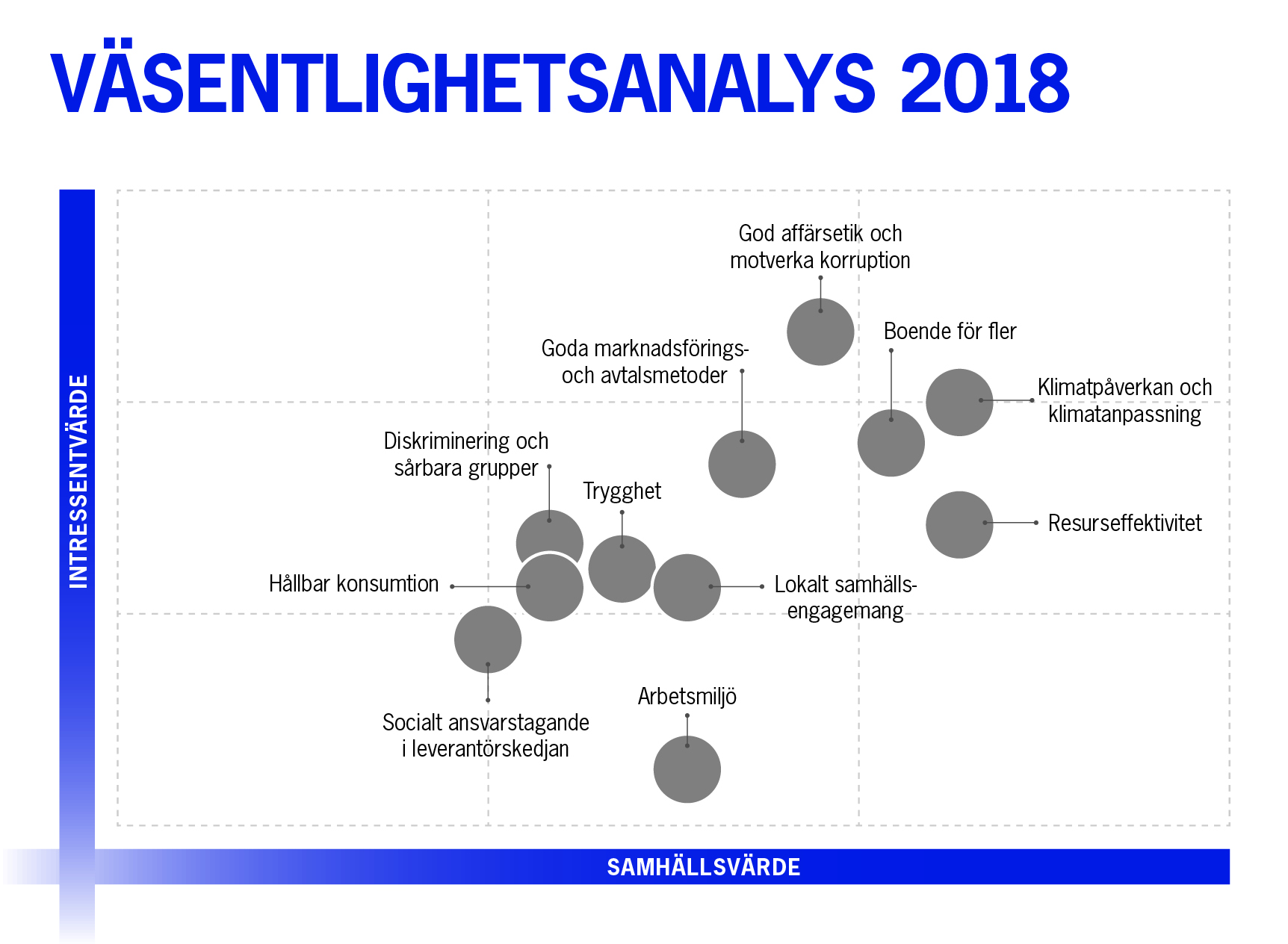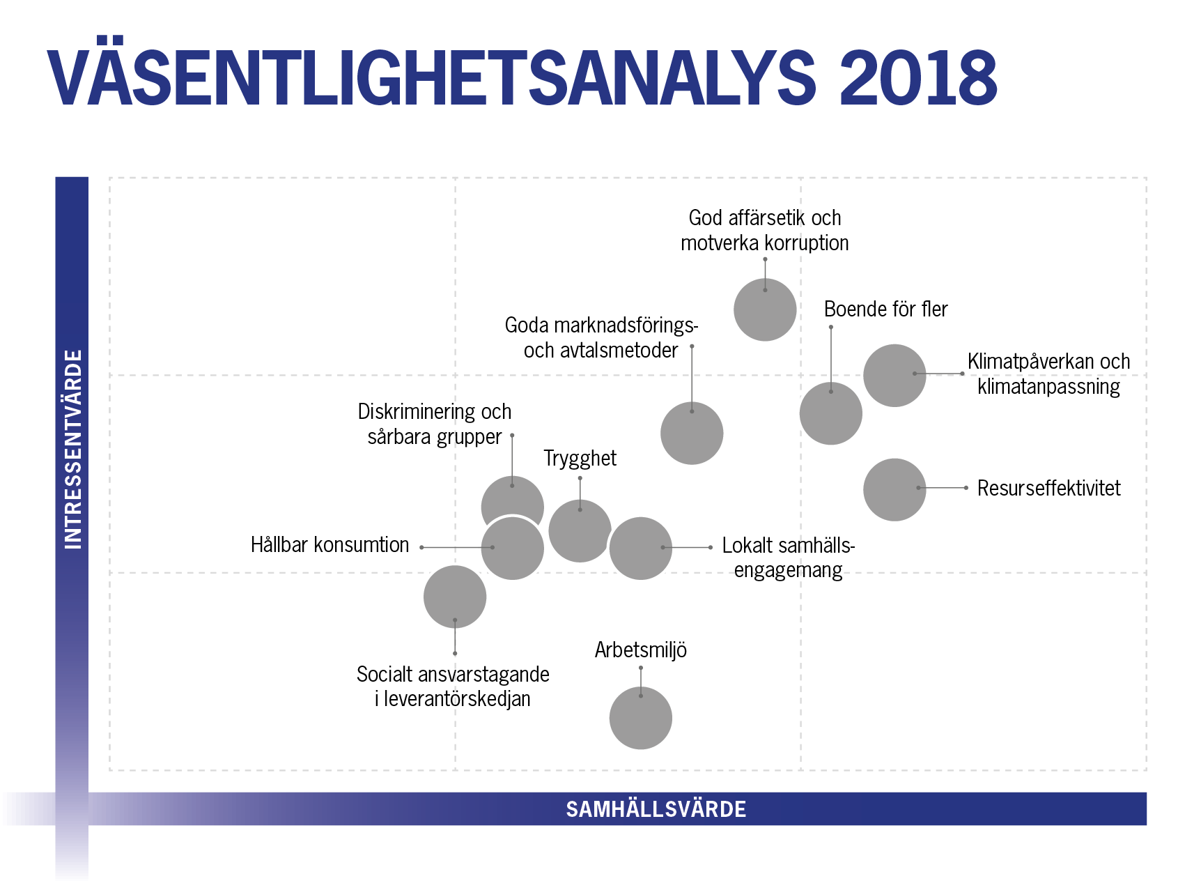 Dessa dialoger och insamling av åsikter från intressenterna under 2017 och 2018 bekräftar de områden som HSB 2016 ansåg vara väsentliga att arbeta med för att vara en ännu mer ansvarsfull och hållbar organisation. Två nya områden som delvis rymdes i den tidigare väsentlighetsanalysen, men inte syntes tydligt har under 2018 lagts till: Boende för flera och Trygghet.