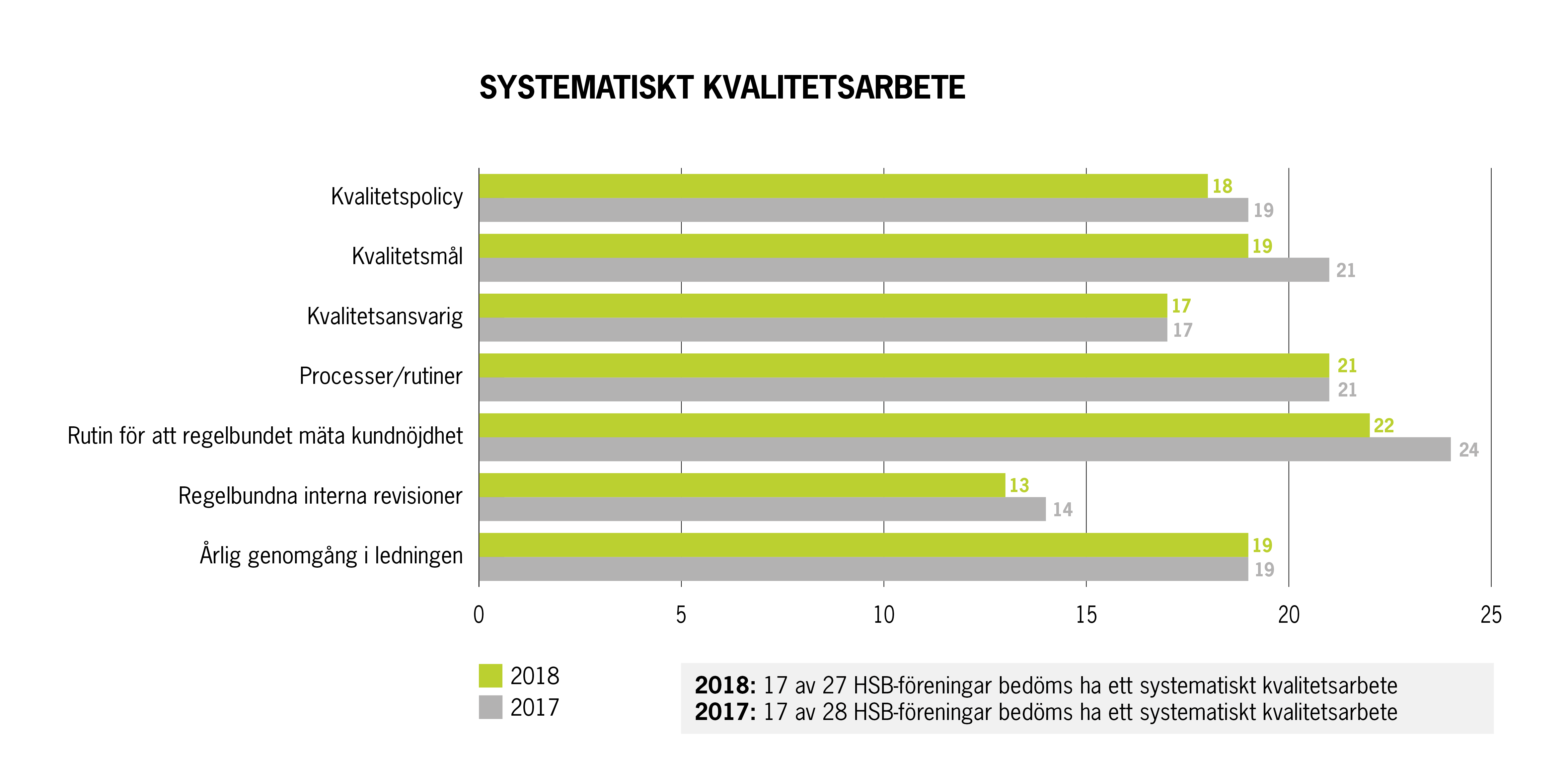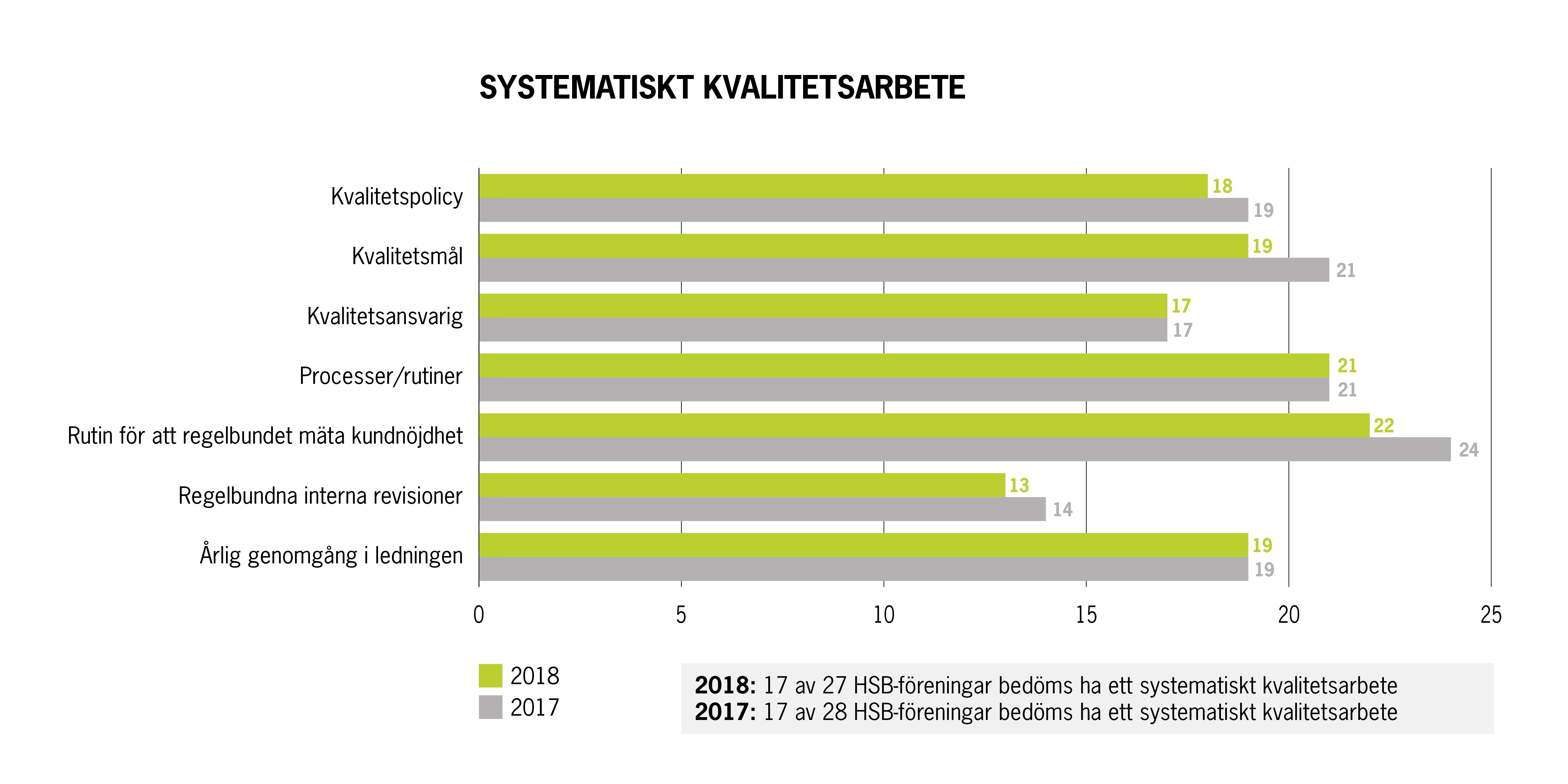 Under 2018 hade 17 av 27 HSB-föreningar ett systematiskt kvalitetsarbete, varav två tillkommit sedan 2017. Detta innebär bland annat en formulerad kvalitetspolicy och kvalitetsmål samt att ha rutiner, processer och uppföljningar för att säkerställa kvalitet i leveransen till våra kunder. 9 HSB-föreningar är kvalitetscertifierade enligt ISO 9001.