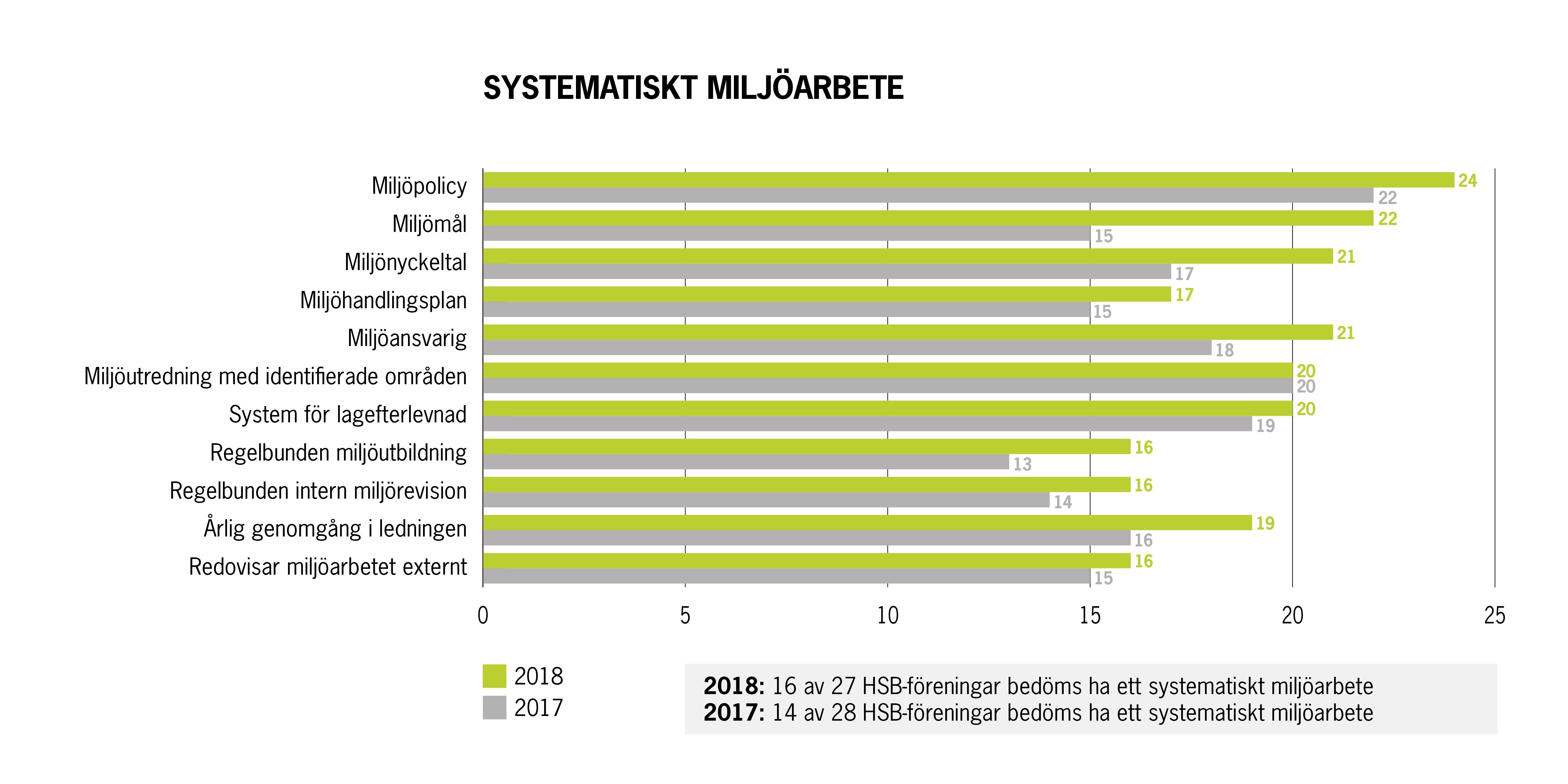 Under 2018 hade 16 av 27 HSB-föreningar ett systematiskt miljöarbete, varav två är nya sedan 2017. Det kan bland annat innebära att HSB-föreningen har en formulerad miljöpolicy, miljöhandlingsplan och genomför regelbundna miljöutbildningar. 8 HSB-föreningar är miljöcertifierade enligt ISO 14001 och 3 är miljödiplomerade med Miljödiplom.