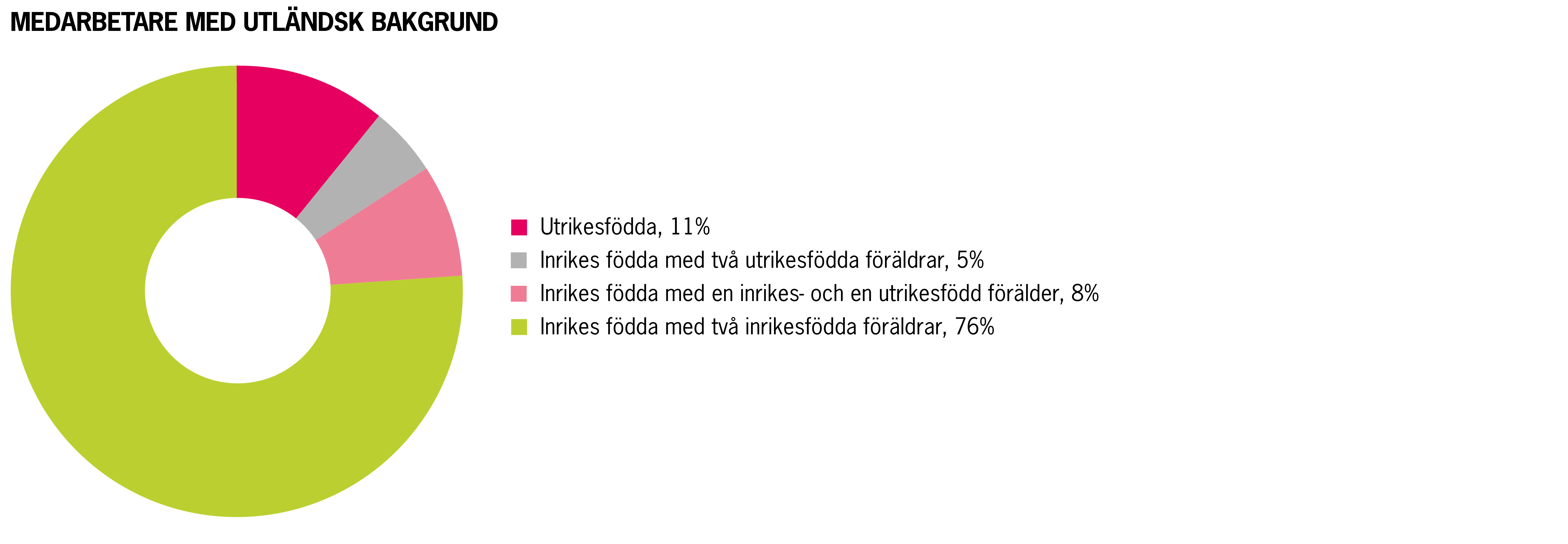 Cirkeldiagrammen är baserade på samtliga nationella bolag och 24 av 27 HSB-föreningar. Samtliga anställda på nationella bolag och HSB-föreningar och deras dotterbolag omfattas av kollektivavtal.