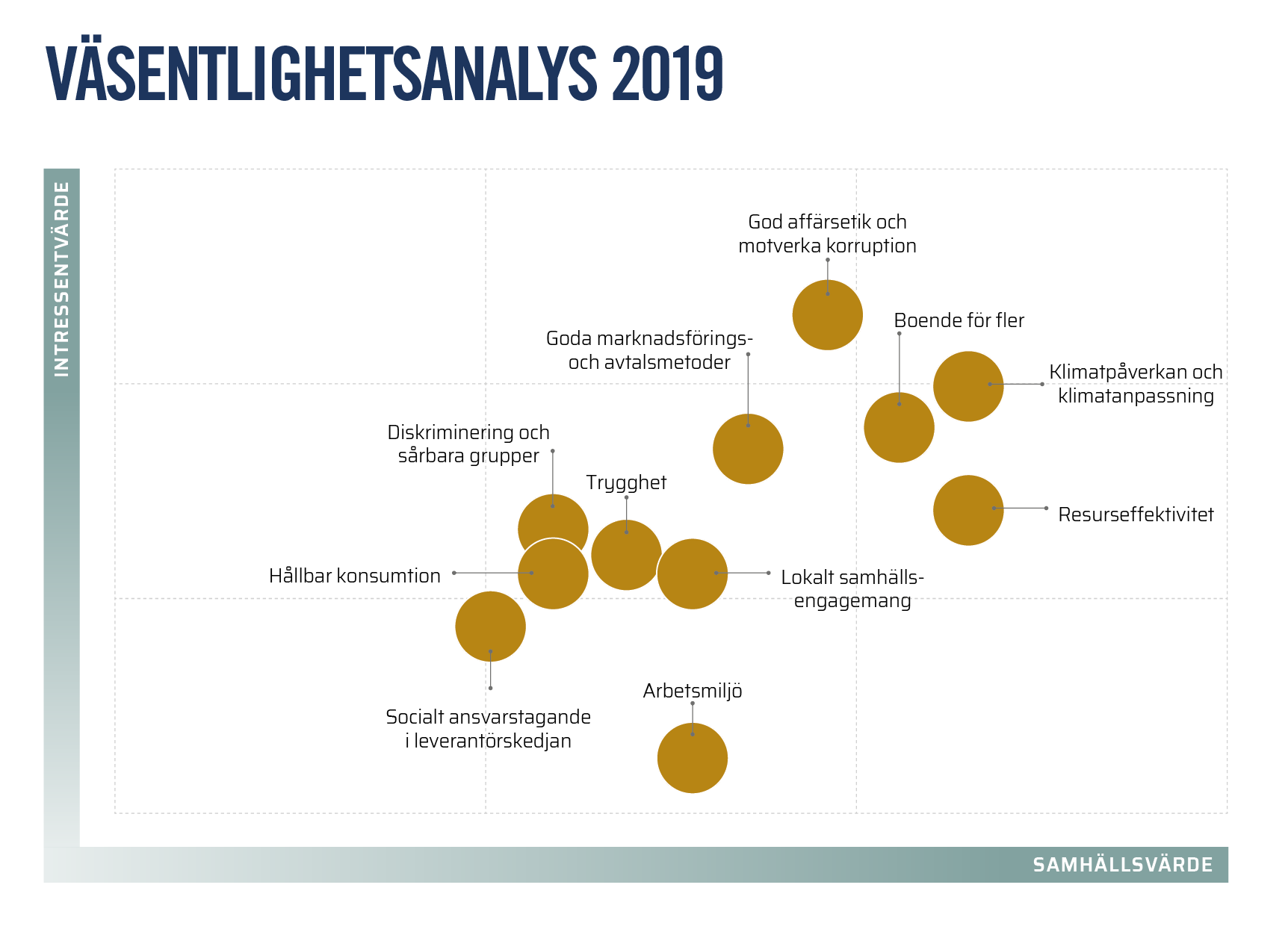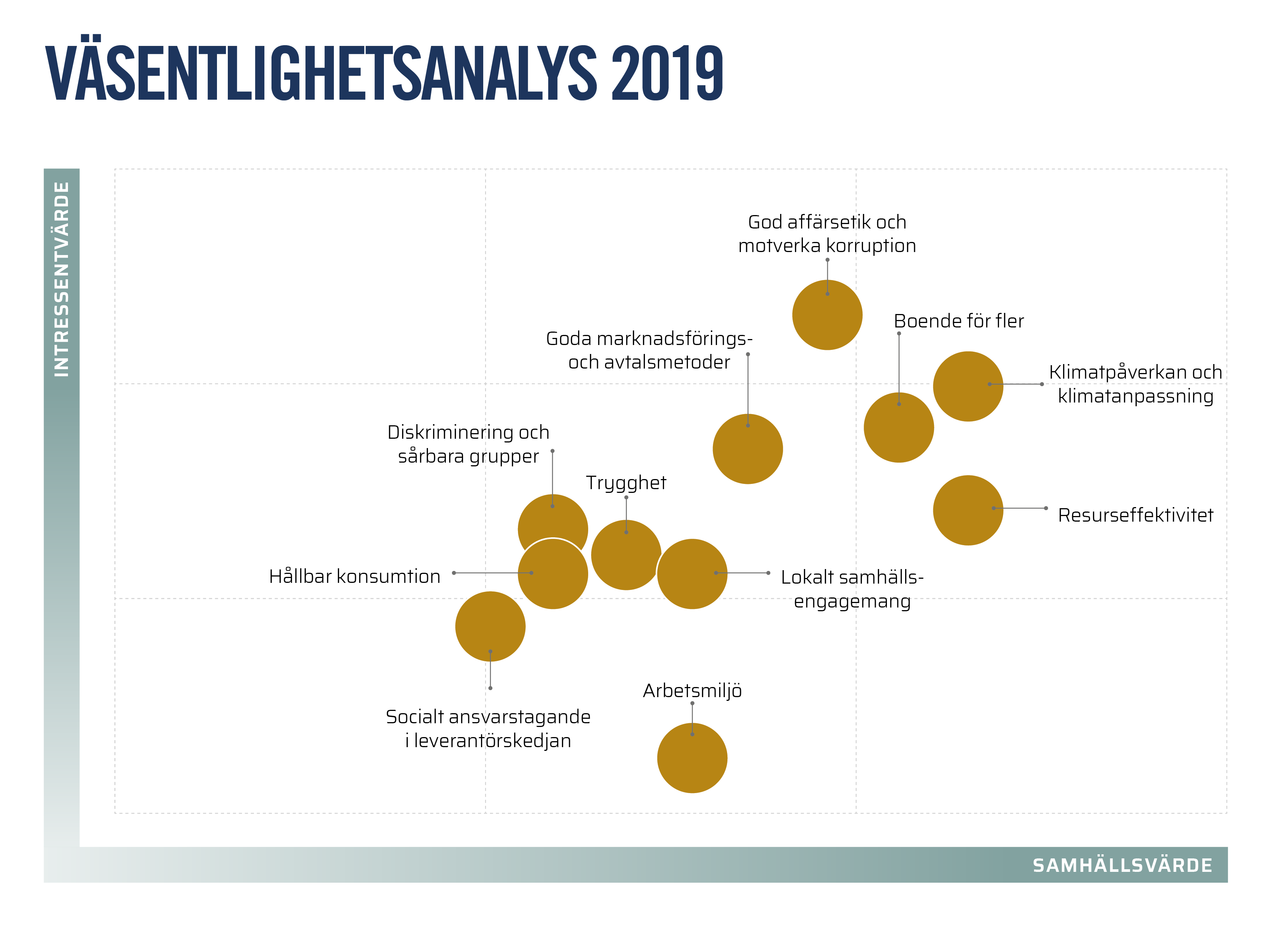 Intressentdialogerna och enkäterna som genomfördes under 2017 och 2018 bekräftar de områden som HSB 2016 ansåg vara väsentliga att arbeta med i strävan att vara en än mer ansvarsfull och hållbar organisation. Under 2018 adderades områdena Boende för flera och Trygghet, två områden som delvis rymdes i den tidigare väsentlighetsanalysen men mindre framträdande.