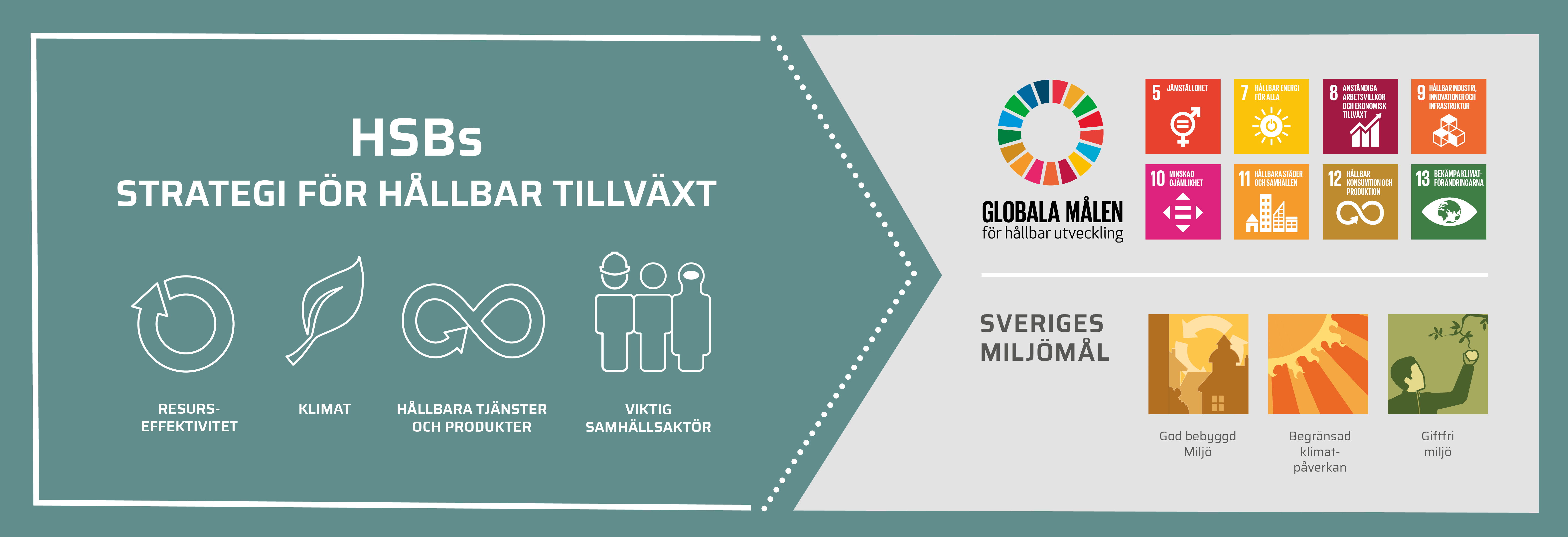 HSB bidrar till en hållbar utveckling med fokus på de mål som är mest relevanta för vår verksamhet och där vi tillsammans med våra medlemmar, kunder och leverantörer kan göra mest positiv skillnad. I egenskap av bostadsaktör innebär det att vi riktar in våra hållbarhetsinsatser mer specifikt till de globala utvecklingsmålen 5, samt 7-13. HSB bidrar också till tre av de 16 svenska miljö- och kvalitetsmålen: God bebyggd miljö, Begränsad klimatpåverkan och Giftfri miljö.