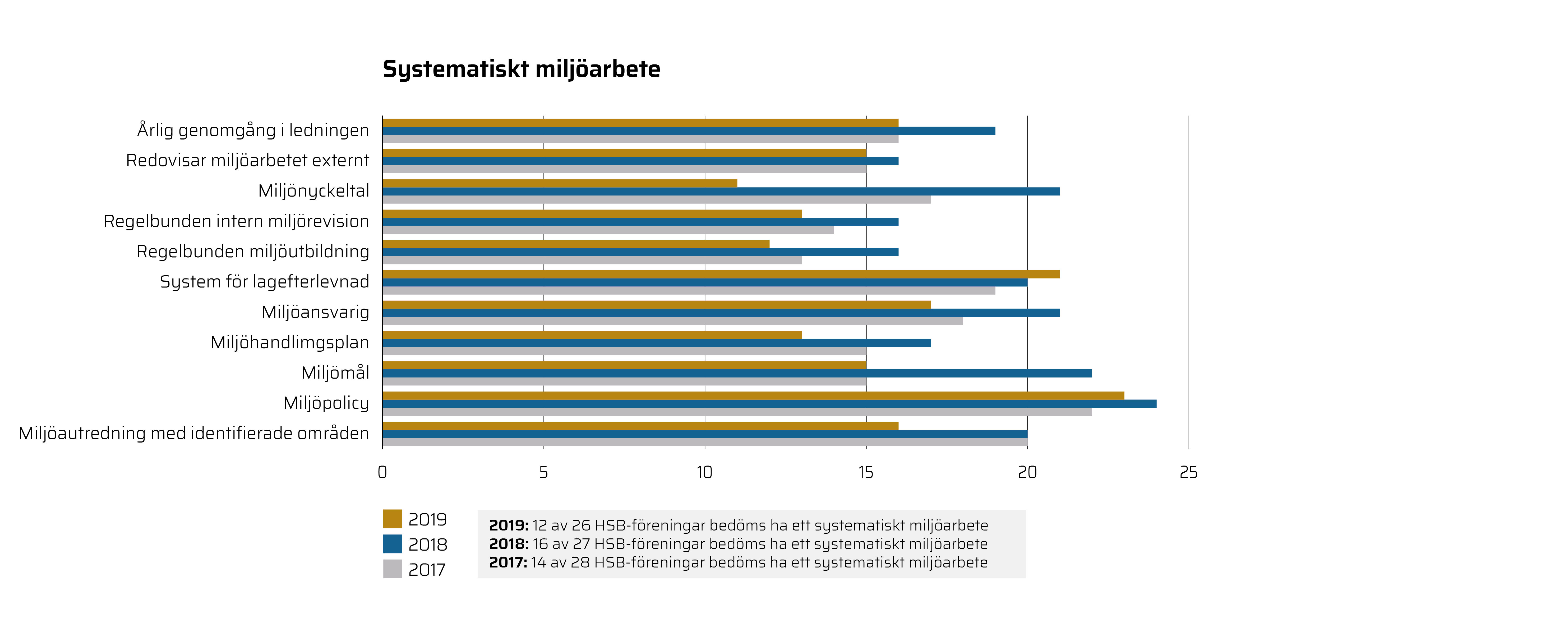 Under 2019 bedrev 12 av 26 HSB-föreningar ett systematiskt miljöarbete, vilket bland annat kan innebära att HSB-föreningen har en miljöpolicy, kort- och långsiktiga mål, miljöhandlingsplan och genomför regelbundna miljöutbildningar. Åtta HSB-föreningar är miljöcertifierade enligt ISO 14001:2015 och två är miljödiplomerade enligt Svensk Miljöbas. Vi ser en trend hos HSBs föreningar av oförnyad certifiering för miljöledningssystem. Däremot förekommer ofta ett systematiskt miljöarbete, dock utan genomförande av tredjepartscertifiering.