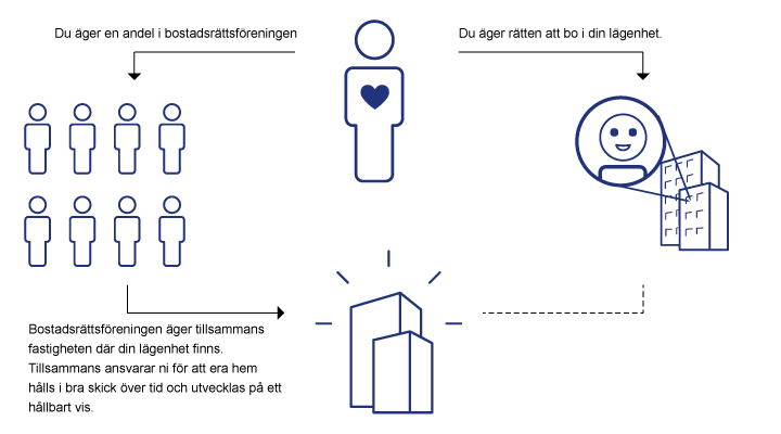 Bostadsrätt är en boendeform där du tillsammans med dina grannar äger hela huset. Det du köper är inte lägenheten i sig utan en andel i föreningen och rätten att bo i din lägenhet.
