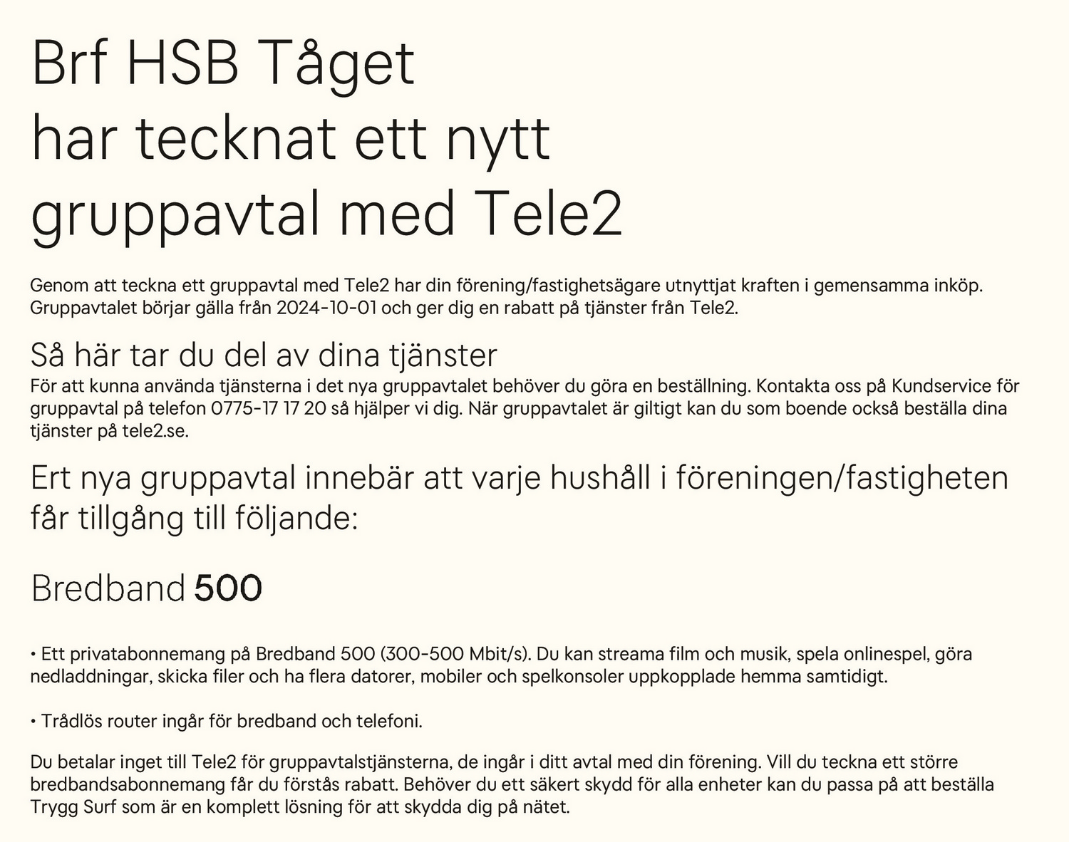 Det nya avtalet innebär att hastigheten höjs från 100/10 mbit/sek till 500/50 mbit/sek. Det nya avtalet gäller från och med den 1 oktober 2024.