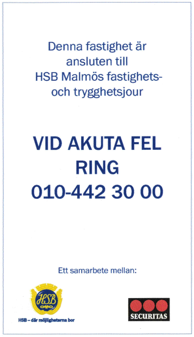 Securitas 010-442 30 00, notera att ärenden som inte rör föreningen utan medlem, kommer faktureras medlem. Gränsdragning finns i stadgarna.