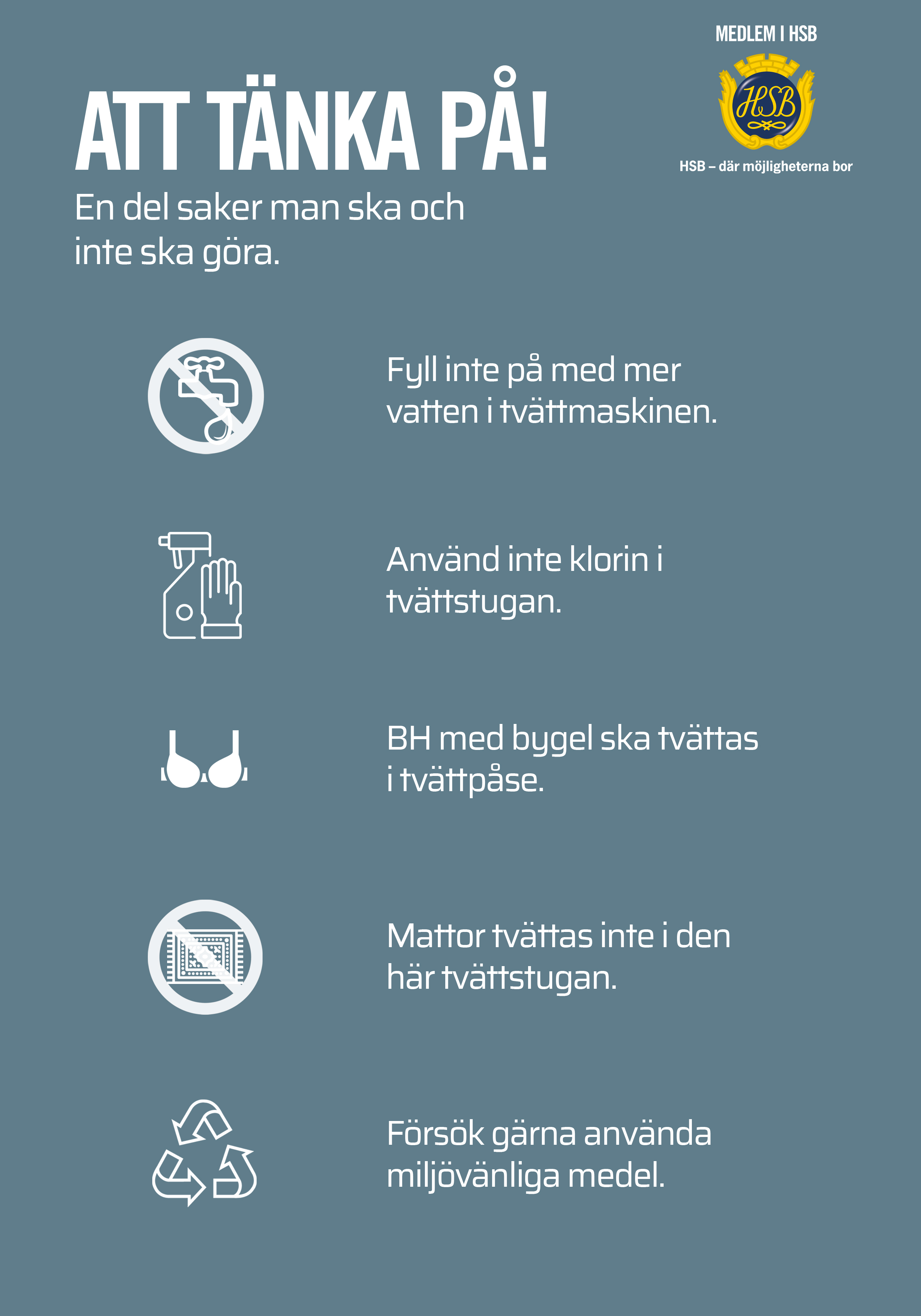 I varje tvättstuga finns förutom två bokningsbara tvättrum en akuttvättmaskin. Ett tvättrum som inte går att boka utan är till för de gånger när det kanske inte alltid blivit som man tänkt sig. Kommer du ner och det är någon som använder tvättmaskinen kan du sätta din tvätt i ”kö”. Tanken är att bara köra en tvätt sen ska man låta någon annan få chansen att tvätta. Detta tvättrum är inte tänkt för att parallellanvända samtidigt som du tvättar i annat tvättrum. Tänk på att alla ska få möjlighet att tvätta.