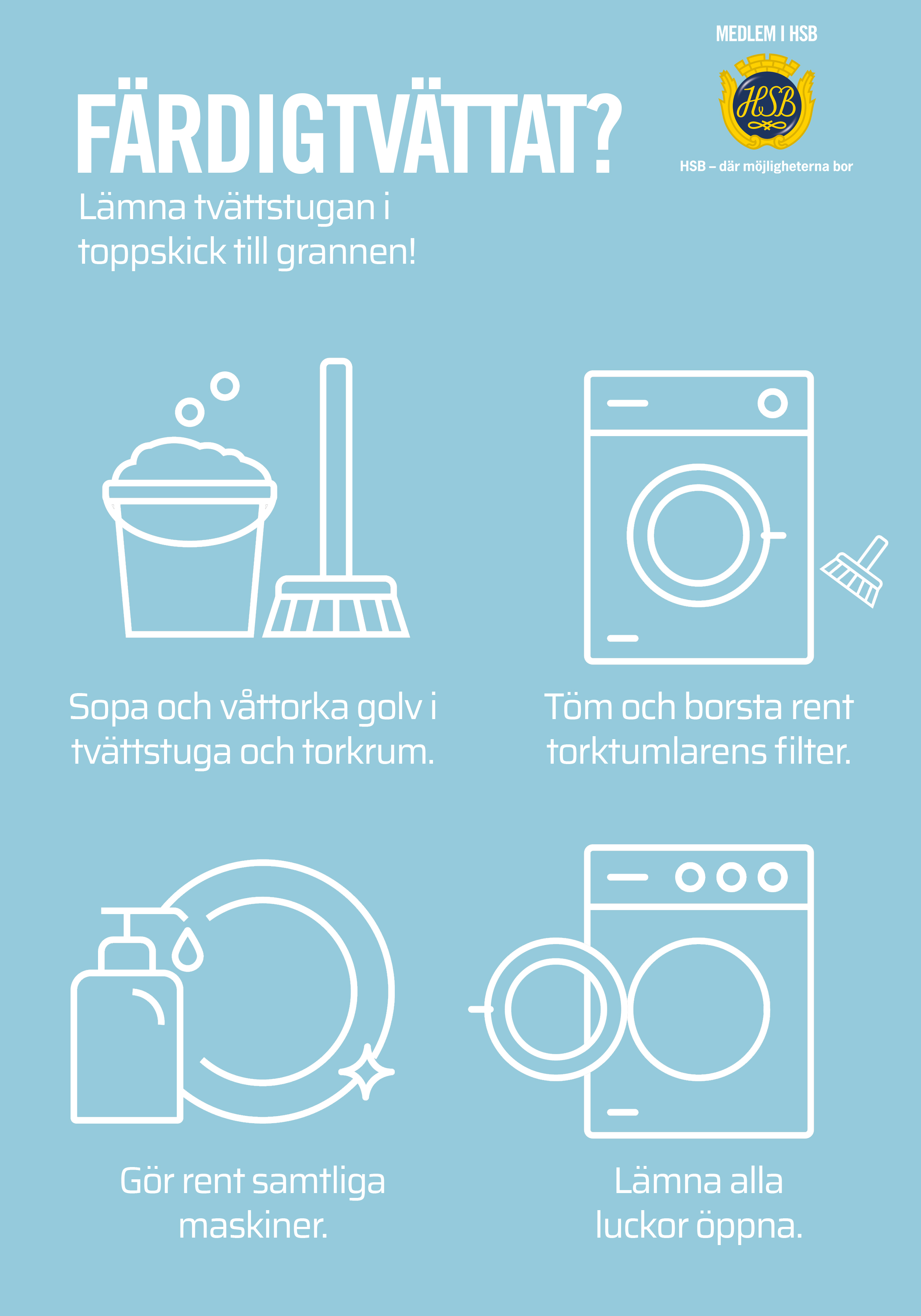 Blir du klar innan ditt tvättpass är över kan avboka tvättpasset via bokningstavlan och låta någon granne använda kvarvarande tid. Tänk på att du avbokar både tvätt- och torkrum.