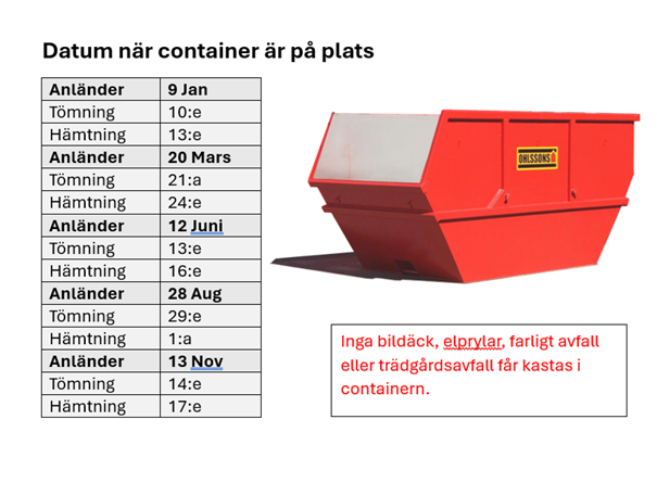 Extra container beställs 5 gånger per år för avfall, som inte hör hemma i vår miljöåtervinningsstation.