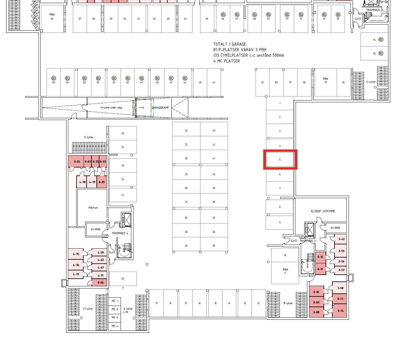 För att komma ner i garaget används befintliga taggar tillhörande lägenheten. Utvändigt finns en taggläsare placerad på väggen till vänster, något längre ned i rampen. För att öppna garageporten från insidan, dra i det snöre som hänger till vänster nedanför utfarten.