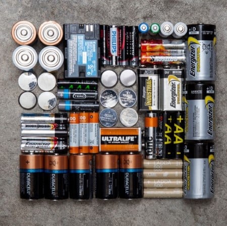Stavbatterier, fyrkantiga batterier och knappcellsbatterier.