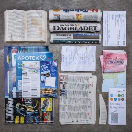 Paketeras i en platspåse precis som vanligt. Kattsand, blöjor, bindor, kuvert, tops, tamponger, diskborstar, tandborstar, trasigt porslin, fimpar och snus, dammsugarpåsar, engångsrakhyvlar, disktrasor, svampar, plåster, vinkorkar, kulspetspennor, ljusstumpar och CD-skivor.