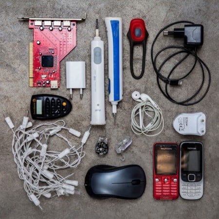 Eltandborste, rakapparat, mobiltelefon, fjärrkontroll, laddsladd till mobilen, hörlurar, liten batteridriven leksak, brandvarnare och datormus.