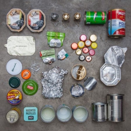 Konservburkar, kapsyler, metallock, metallclips, metalltuber och aluminiumfolie.