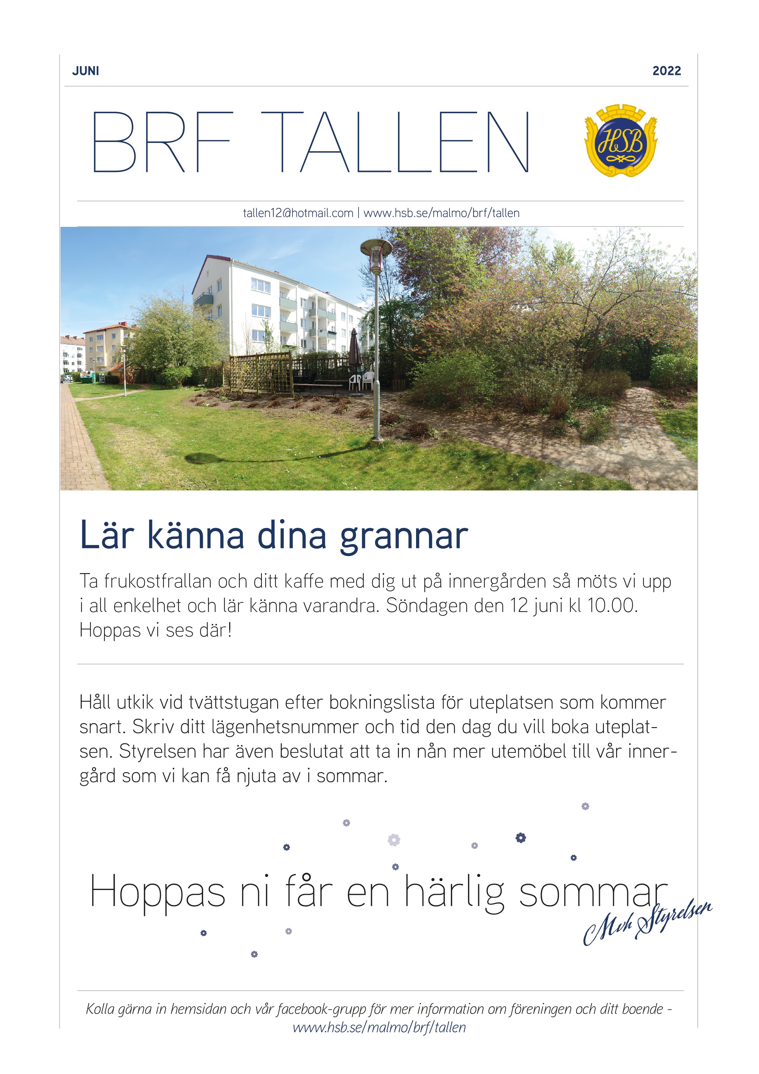 Håll utkik vid tvättstugan efter bokningslista för uteplatsen som kommer snart. Skriv ditt lägenhetsnummer och tid den dag du vill boka uteplatsen. Styrelsen har även beslutat att ta in nån mer utemöbel till vår innergård som vi kan få njuta av i sommar.
