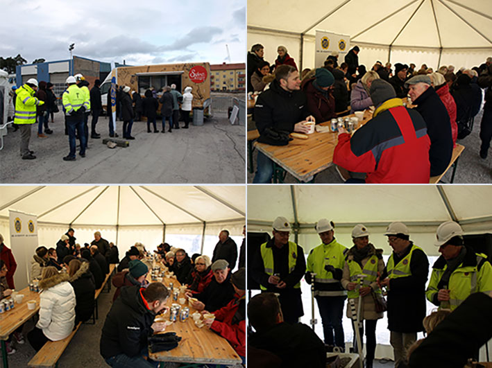 Det bjöds på värmande soppa från Spira Foodtruck och det symboliska spadtaget togs inne i det varma tältet, där kommunalrådet Paul Åkerlund, Jonas Torstensson från Tommy Byggare, Carina Bergman (lägenhetsköpare) samt Roland Helmner tf VD HSB Nordvästra Götaland höll i spadarna.