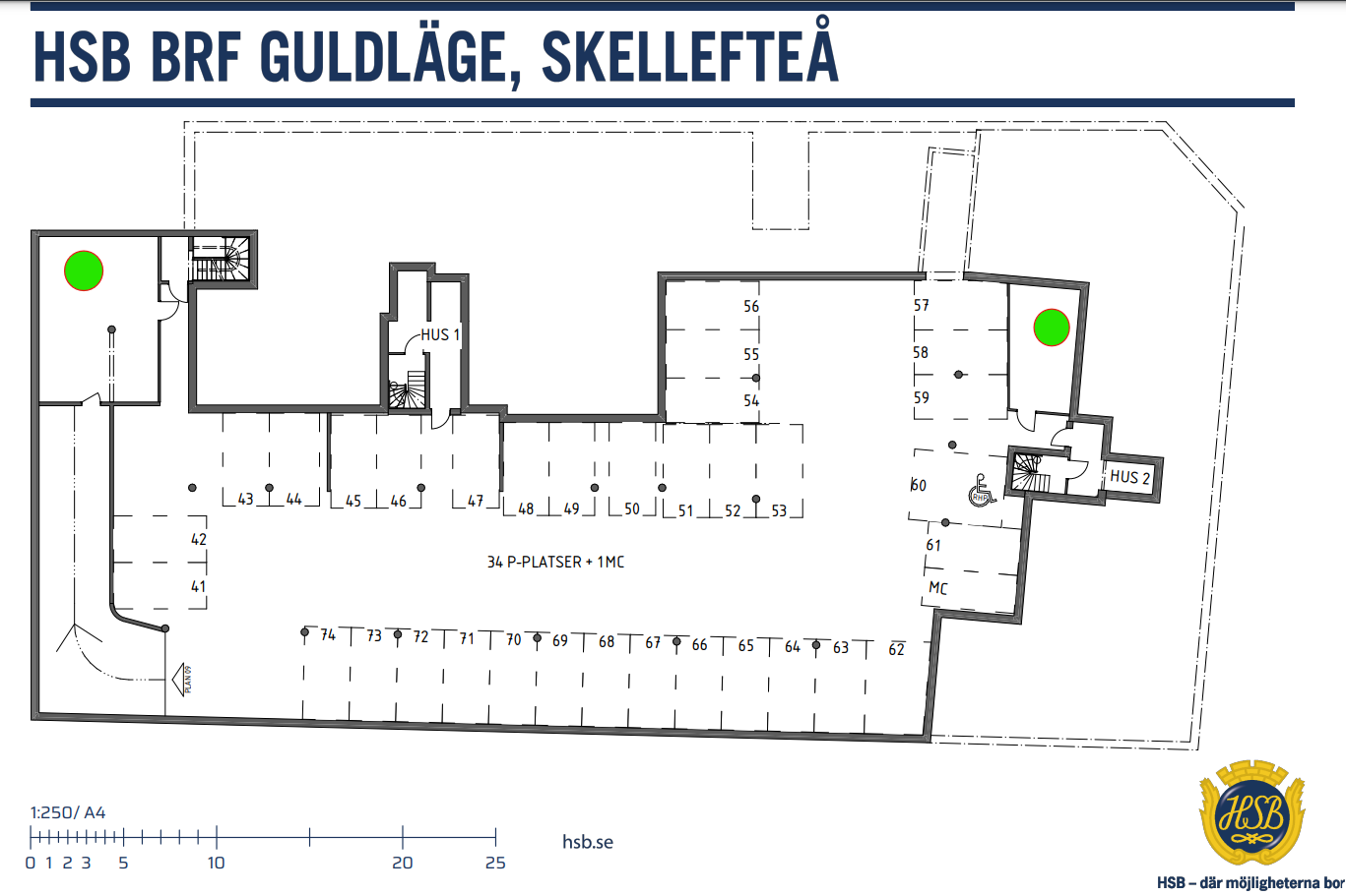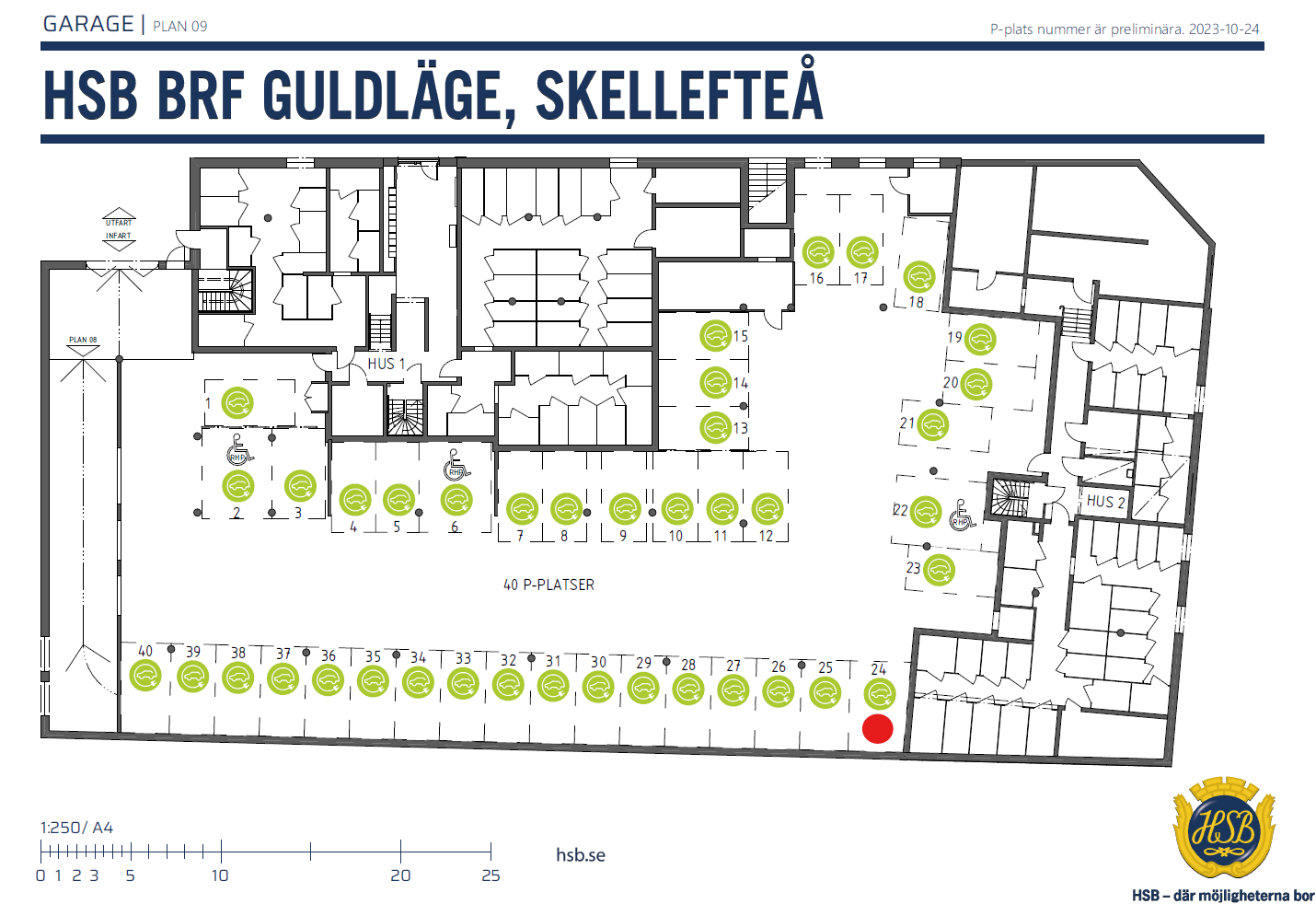 På plats nr 19 står det cyklar och andra färdmedel som nu behöver flyttas för att göra plats åt en ny granne. Cyklarna kan ni ställa i cykelförråden på nedre garageplanet -2, se gröna markeringar. Vespor, mopeder och elkickar kan ställas på plats nr 24 på övre garageplan -1, se den röda markeringen.