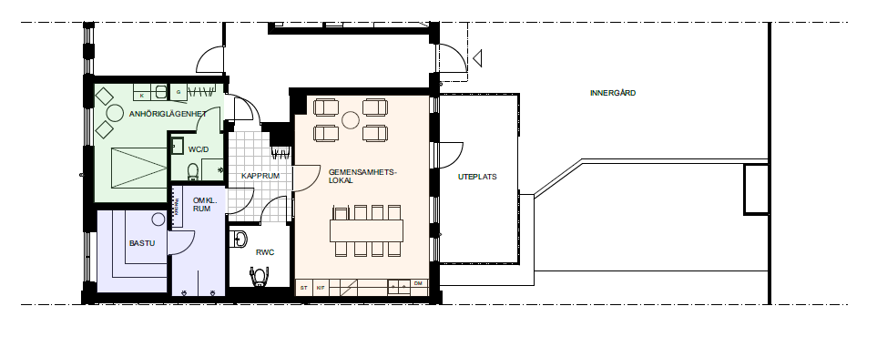 Som inflyttningspresent har HSB Norr möblerat upp övernattningslägenheten och gemensamhetslokalen med en grund som bostadsrättsföreningen sedan själva kan bygga vidare på. Nedan hittar du ritning av lokalen, observera att mått och dimensioner kan komma att ändras under projekteringen.