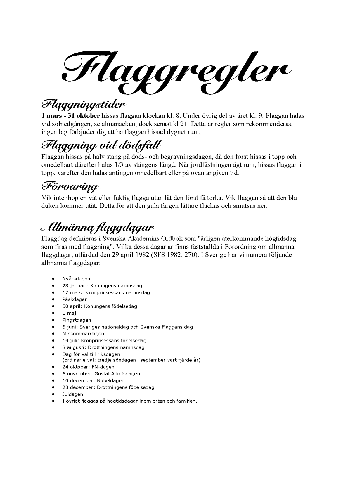 Till vardags kommer där att finnas en vimpel upphissad i flaggstången men alla medlemmar kan fritt låna den svenska flaggan (som finns hos vicevärden) om man vill fira Flaggdagar, Födelsedagar, m.fl. Den medlem som hissar svenska flaggan måste själv också ta ner (hala) den på kvällen samma dag. Regler för hissande av svenska flaggan kommer att finnas hos vicevärden.