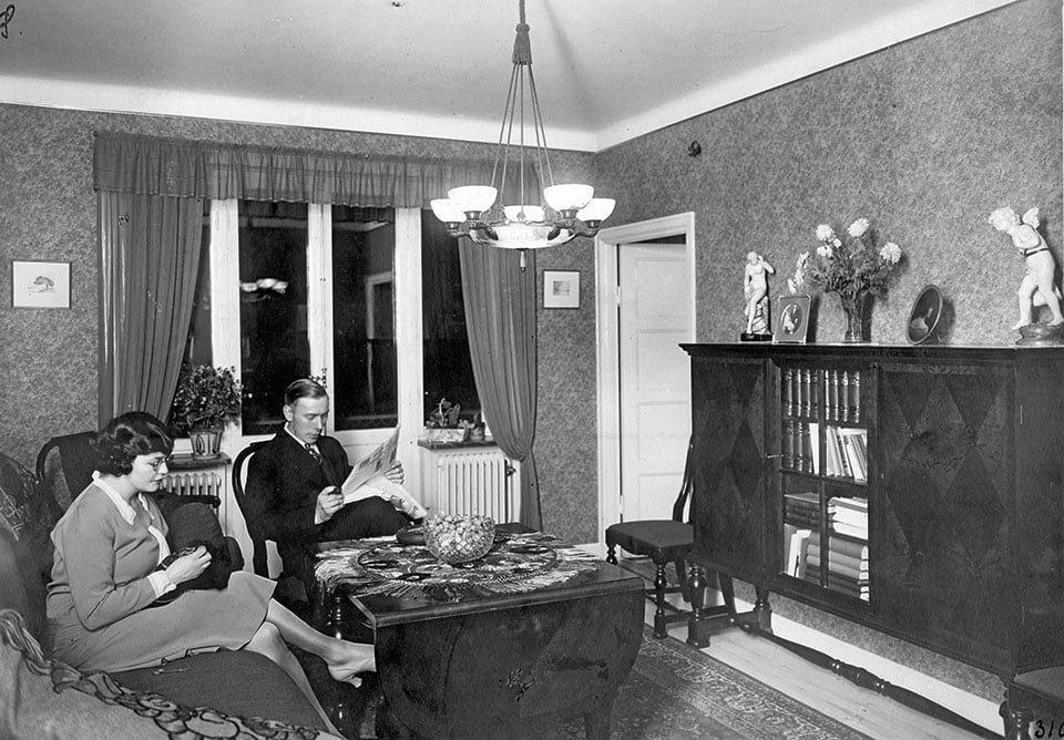 Under 1900-talets början skulle vardagsrummet, eller finrummet som det kallades, vara en prydnad för hemmet och en plats för lugna och högtidliga aktiviteter. Bilden visar en HSB-lägenhet från 1920-talet.