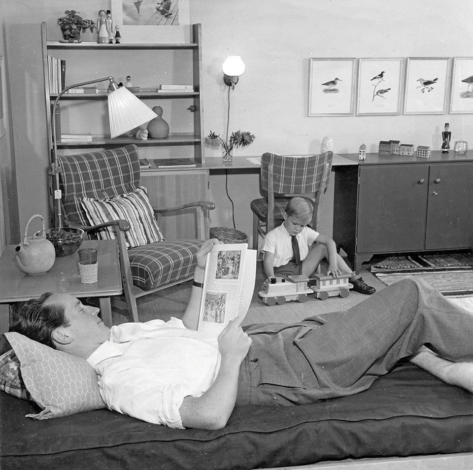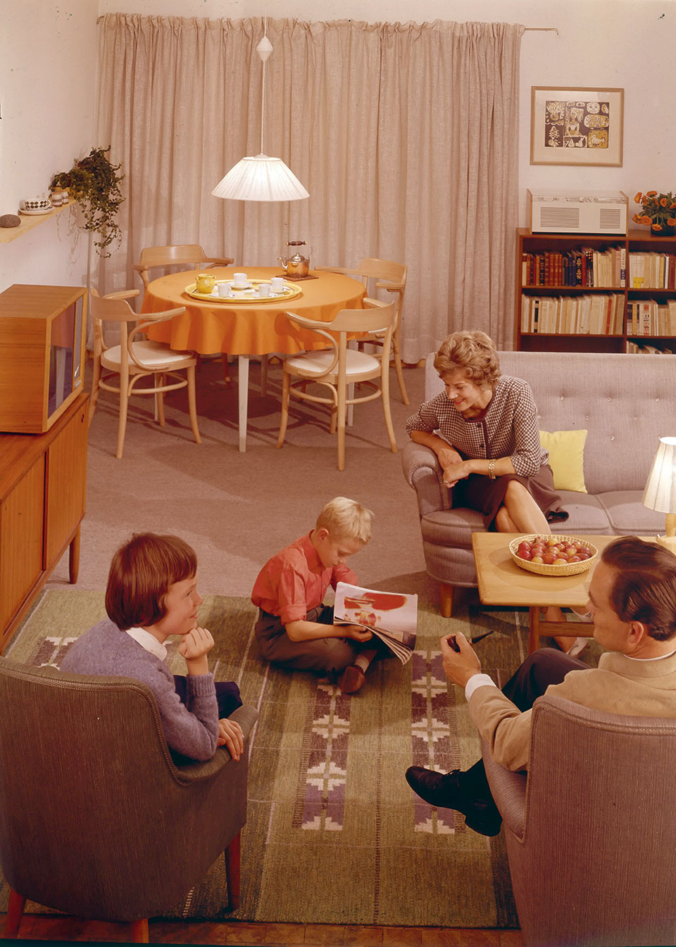 Mot mitten av 1900-talet hade tanken om finrummet försvunnit, och vardagsrummet hade blivit en plats för dagliga aktiviteter och lek. Bilden är hämtad från HSB-utställningen Bara vara till vardags.