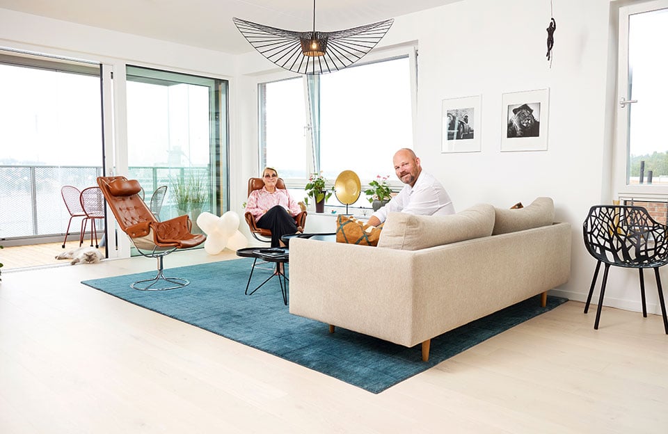 I dag är det ljust och rymligt som gäller i våra vardagsrum. Den här nyproducerade HSB-lägenheten på Telegrafberget i Saltsjö-Boo har dessutom en vidunderlig utsikt. Skandinaviska designklassier inköpta på second hand sätter stilen.