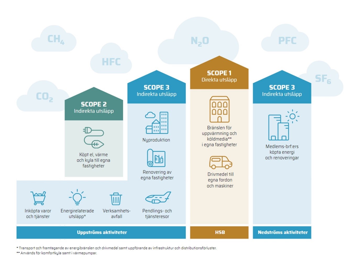 * omfattar scope 1 och 2, utsläpp som genereras från drivmedel till HSBs fordon och maskiner, bränsle till uppvärmning av egna fastigheter och el, värme och kyla i våra egna fastigheter.