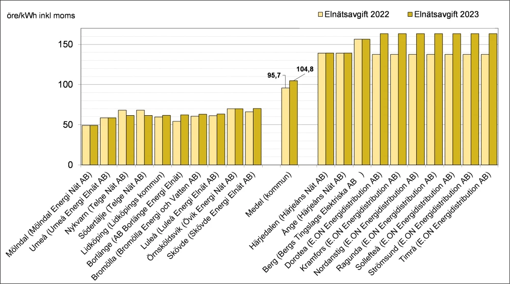 Figurerna nedan visar elnätsavgifter för billigaste och dyraste kommunerna i Sverige samt de kommuner där prisförändringen varit som störst.