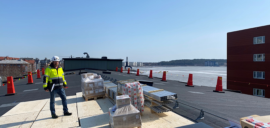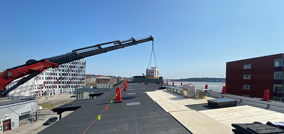 Vi besöker HSB Brf Varvet-Hägern en solig vårdag när materialet till solcellsanläggningen ska lyftas upp på taket och innan vårt besök har man redan färdigställt infästningen i takpappen. Därmed blir nästa steg att montera skenor som solcellerna sedan ska fästas i.