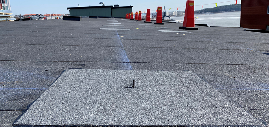 Här ser vi infästningen som består av en platta som man bränner ny takpapp ovanpå för att säkerställa takets tätskick.