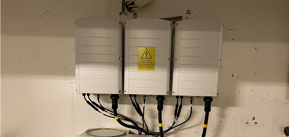 Från anläggningen på taket matas kablage in i fastigheten till växelriktaren. El som produceras av solceller är likspännig och växelriktaren gör om elen från likspännig (DC) till växelspänning (AC) el. På så sätt kan elen nyttjas i fastigheten och levereras ut på nätet.