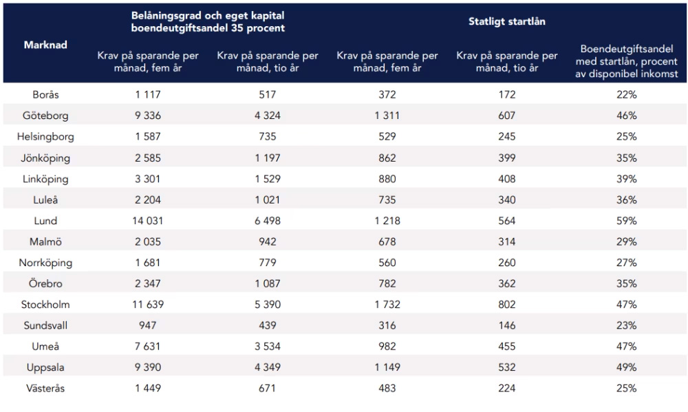 Storstäderna ligger i toppen av listan, där det krävs att en ung vuxen i Stockholm lägger undan hela 11 639 kr i månaden i fem år för att få ihop till den summa som krävs enligt det nuvarande bolånetaket och krav på eget kapital. Stockholm följs tätt av Uppsala (9 390 kr/mån) och Göteborg (9 336 kr/mån).