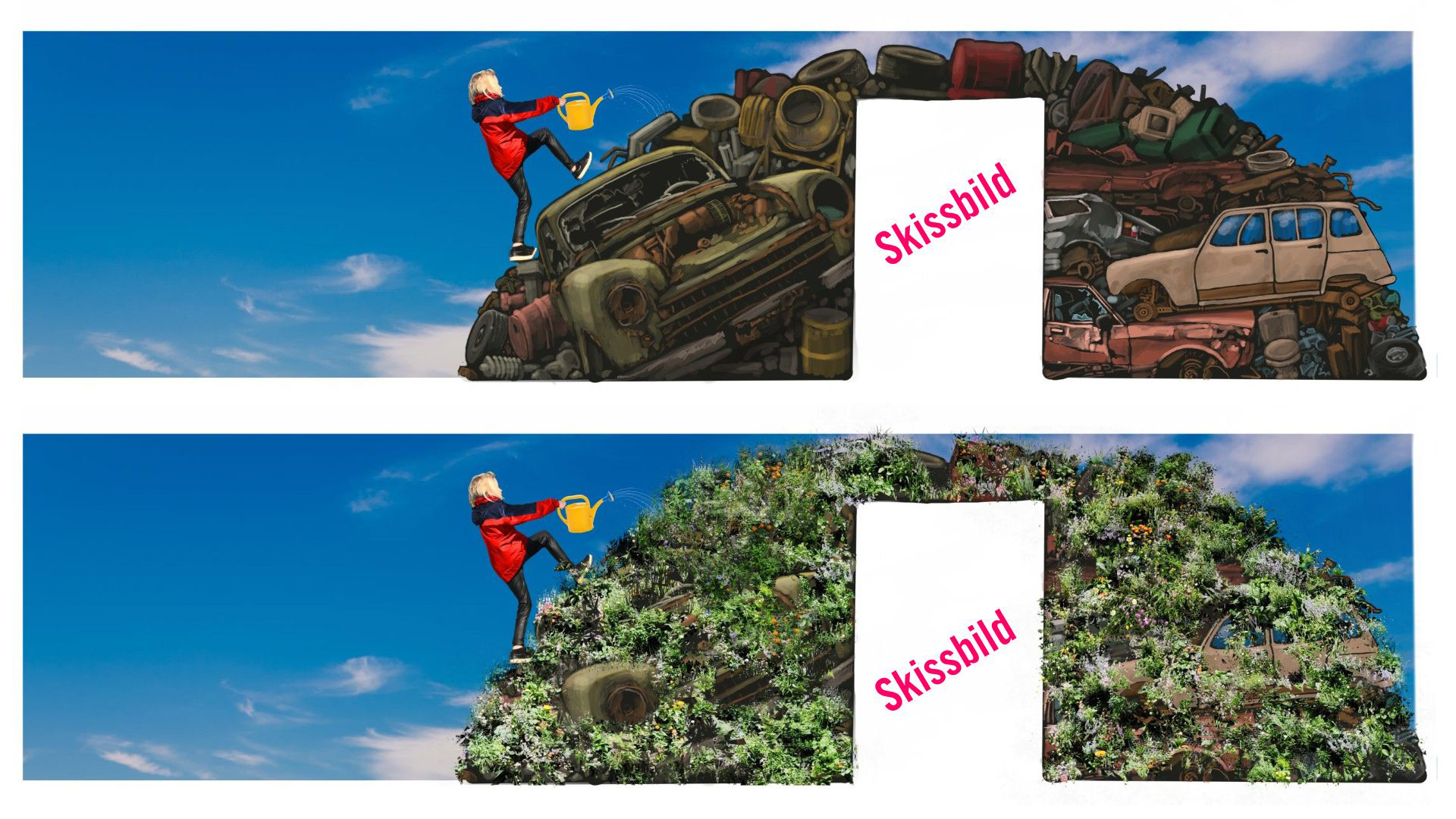 – Idén är att det är en liten flicka som går över en skrothög med en vattenkanna. Det är växter planterade i skrothögen så när det börjar växa döljs skrotet av grönska. Jag tycker det passar bra på ett miljöhus där alla hjälps åt att återvinna avfall, och så finns det en tydlig referens även till Normann Bröndbo och brf:ens namn, säger Charlie Granberg.