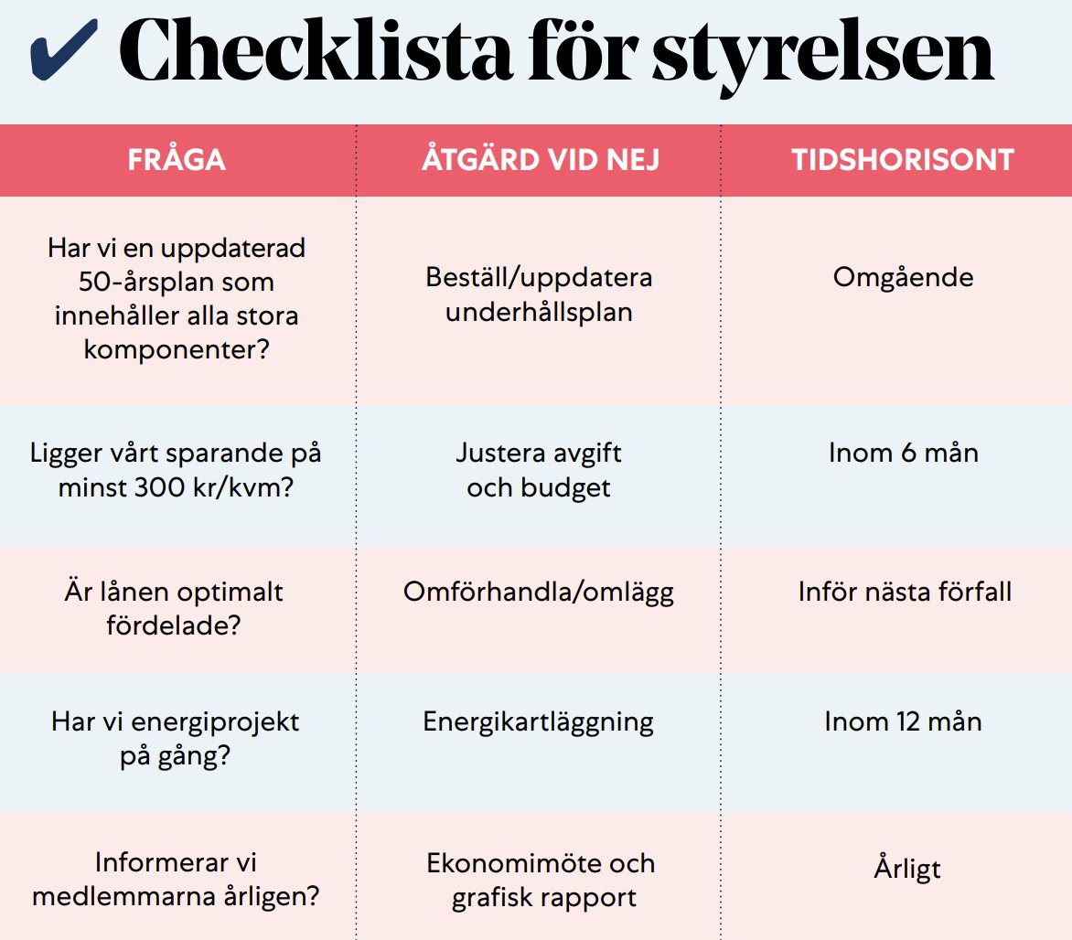 – Planera föreningens ekonomi på tio års sikt för att kunna se vilken avgift som behövs nu för ett vettigt sparande. Och ha en transparent kommunikation om avgiften med medlemmarna. Det är avgörande för en långsiktig värdeutveckling i brf:en.
