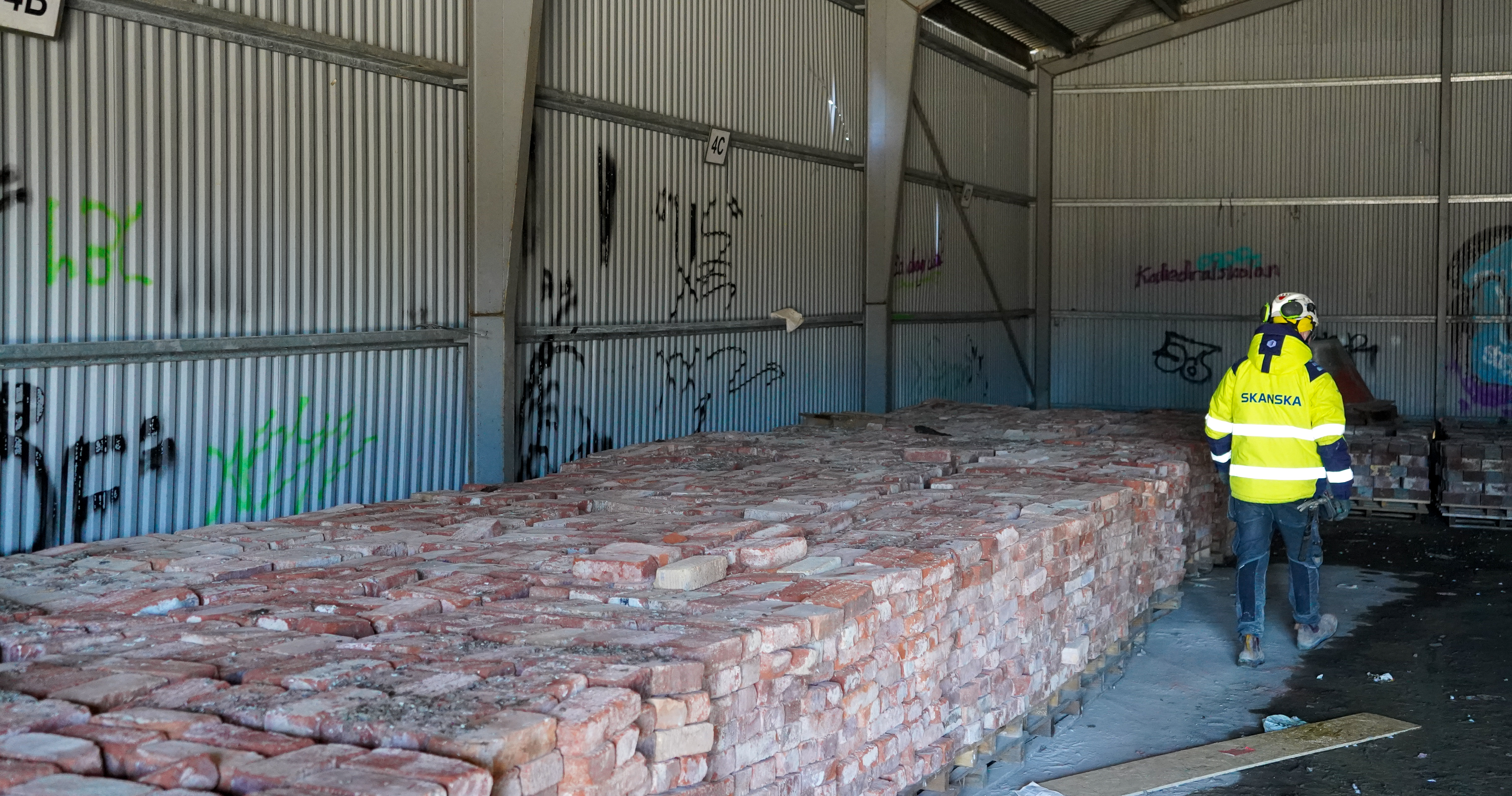 Under vårt besök fick vi möjlighet att kika närmare på det tegel som snart får nytt liv i fasaden på HSB brf Fabrikören. De återbrukade tegelstenarna kommer från CEPAs tidigare byggnader och har noggrant trycktestats, sanerats och sorterats på samma plats där de en gång stod murade. Totalt handlar det om cirka 600 kvadratmeter tegel som nu blir en del av framtidens bostäder.