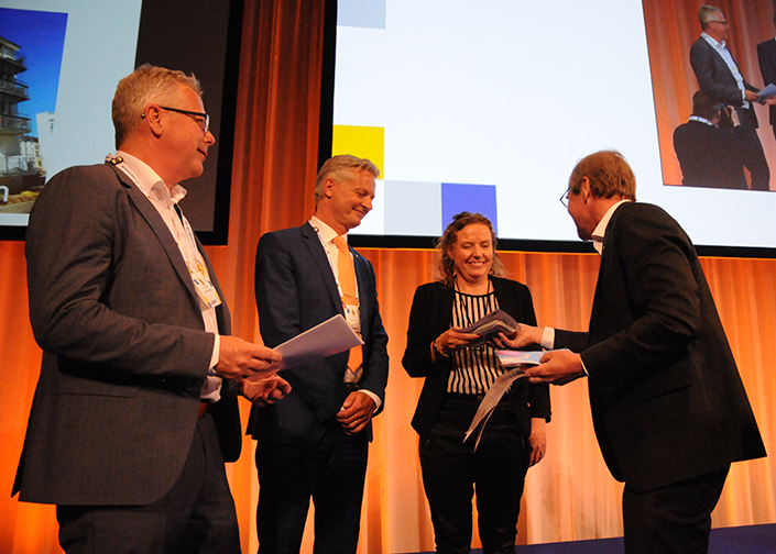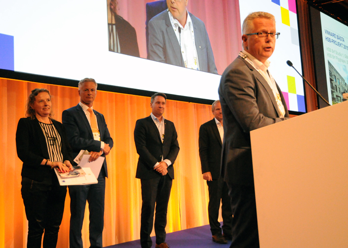 Lars Göran Andersson, vd HSB Göteborg, Anders Svensson, vd HSB Stockholm och Lena Josgård, affärsområdeschef mark- och projektutveckling HSB Göteborg tar emot diplom, ett gåvobrev på respektive 5000 kr till We Effect och en handduk från We Effect. Bilden nedan i mitten finns HSB Bostads vd Jonas Erkeborn med. HSB Bostad är det bolag som bygger i Stockholmsregionen.