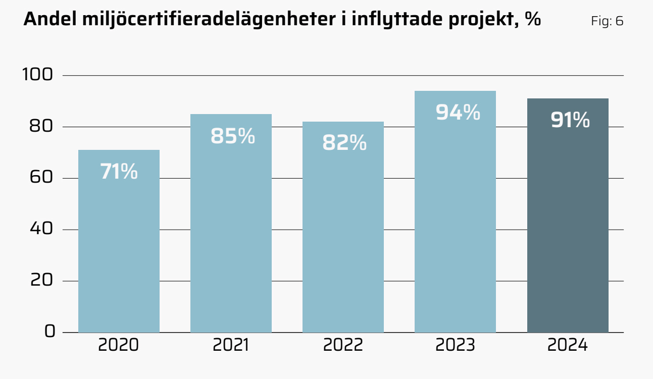 Under 2024 var 91 (94) procent av HSBs färdigställda lägenheter certifierade enligt Miljöbyggnad Silver (statistiken avser nyproduktion inom HSB ProjektPartner och HSB Bostad). Se grafik nedan.