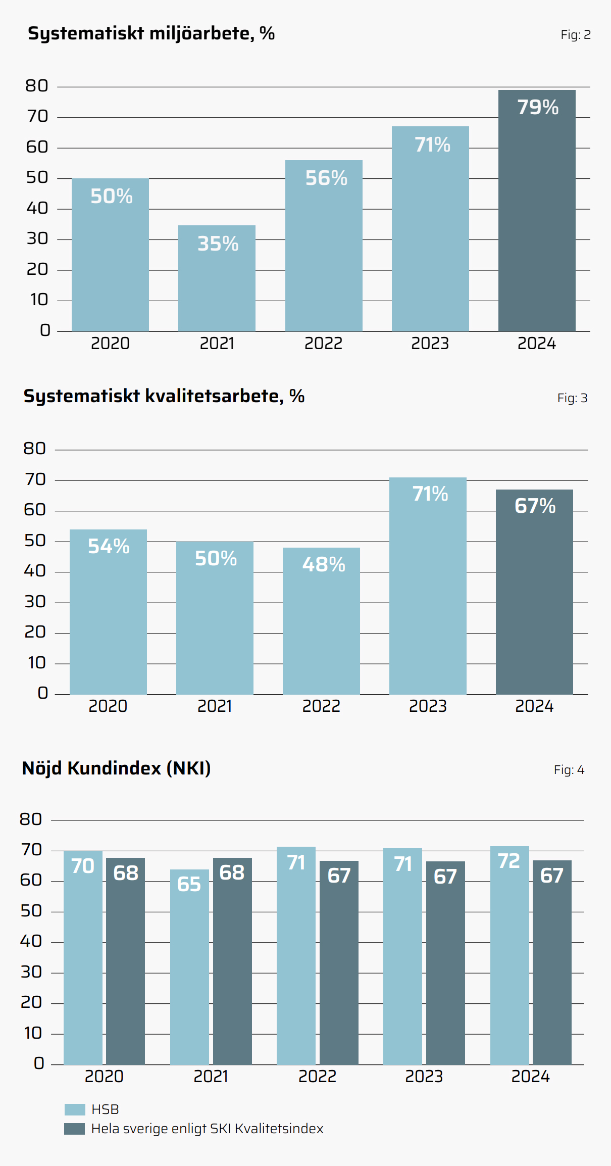 Under 2024 hade 16 av 24 HSB-föreningar ett systematiskt kvalitetsarbete, vilket motsvarar 67 procent av föreningarna. En minskning med fyra procentenheter sedan föregående år. Att arbeta systematisk med kvalitet innebär bland annat att man har en formulerad kvalitetspolicy och kvalitetsmål samt rutiner, processer och uppföljningar för att säkerställa kvalitet i leveransen till våra kunder och medlemmar.