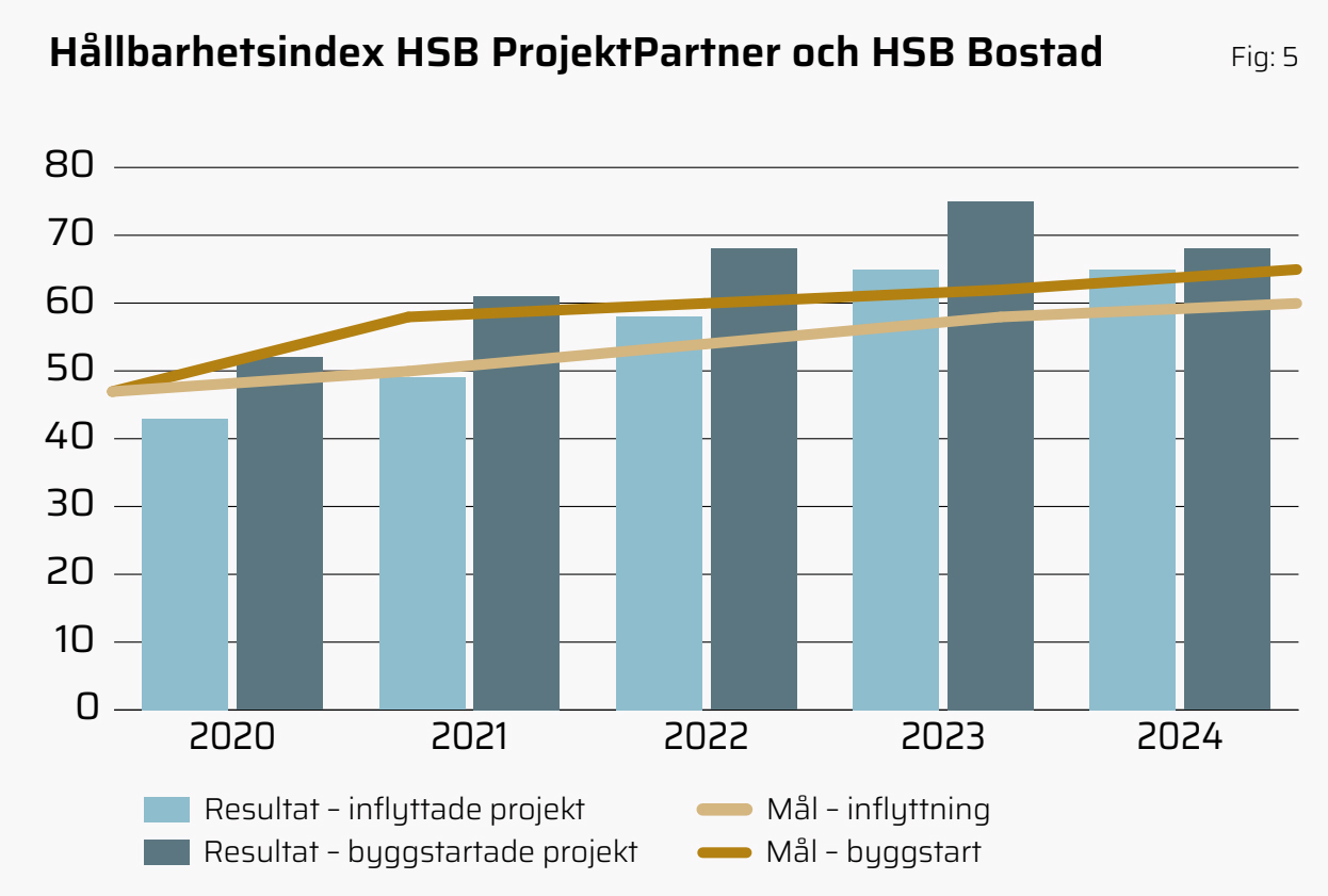 Ovan visas HSB ProjektPartners och HSB Bostads sammanvägda utveckling för Hållbarhetsindex. Det har ökat stadigt och legat över uppsatta mål under flera år, men 2024 backar snittet för första gången jämfört föregående år. Resultatet ligger fortsatt över uppsatta mål för HSBs nyproduktion som helhet. Inbromsningen är främst en följd av en tuff marknad med färre och senarelagda byggstarter, som innebär att projekten projekteras enligt mål för ett visst år men startas först senare. Med färre projekt får varje enskilt projekt också stor påverkan på totalen.