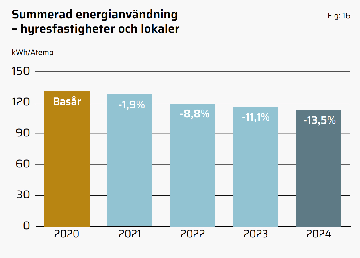 Mellan 2020 och 2024 minskade HSBs totala mängd köpt energi (kWh/Atemp) i egenägda hyresfastigheter och lokaler med 13,5 procent. Elanvändningen har minskat med cirka åtta procent och köpt fjärrvärme med nio procent mätt i kWh med utgångspunkt från 2020. De energiposter som är inkluderade i ovanstående är driftel, kontorsel, fjärrvärme, fjärrkyla samt den mindre mängd bränslen som används för uppvärmning av fastigheter (eldningsolja, naturgas och pellets).