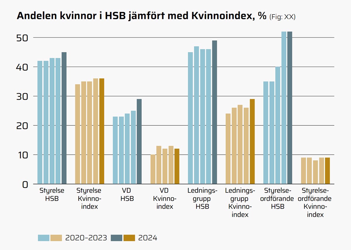 Diagrammen ovan är baserade på nationella bolag och HSB-föreningar, totalt 27 av 29. Kvinnoindex är AP-fondens årliga mätning av andelen kvinnor på mellanchefsnivå.