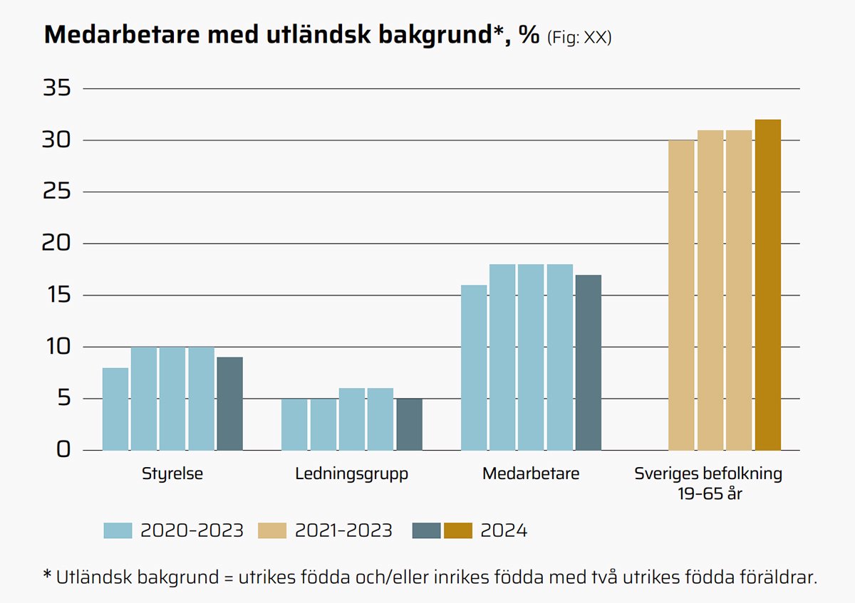 Totalt hade 17 (2023:18) procent av medarbetarna i HSB utländsk bakgrund 2024. Motsvarande siffra i ledningsgrupper var 5 (6) procent och i styrelser 9 (10) procent. Det kan jämföras med andelen folkbokförda i Sverige med utländsk bakgrund i åldern 19–65 år, som enligt Statistiska Centralbyrån var 32 procent under året. 27 av 29 HSB-föreningar och bolag rapporterade 2024.