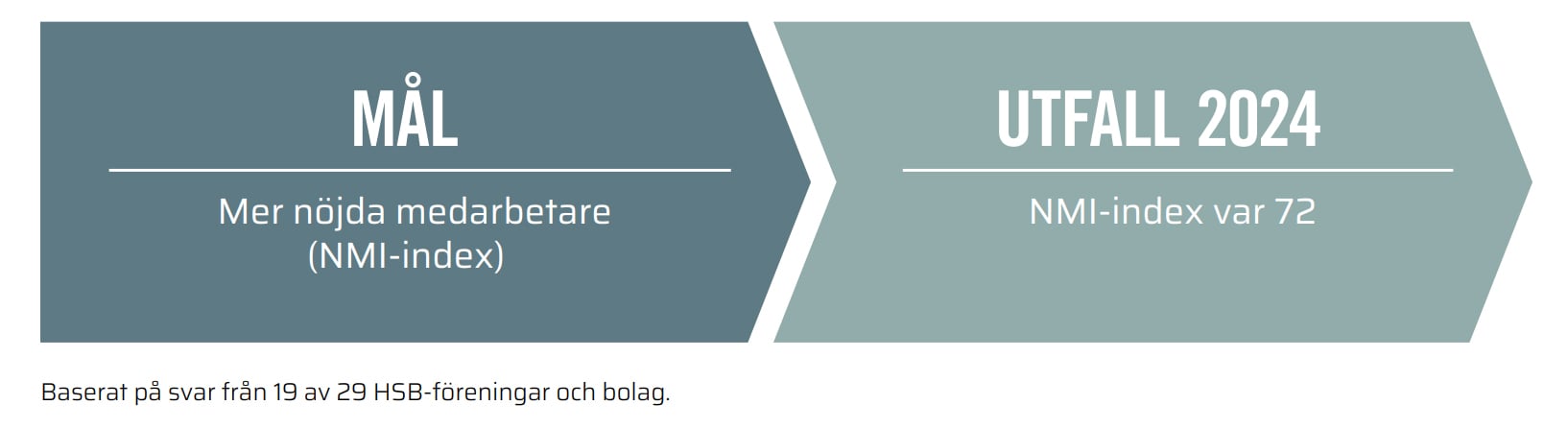 För att följa upp hur HSBs medarbetare upplever sin arbetssituation genomförs medarbetarundersökningar minst vartannat år. Ett viktigt nyckeltal är NMI-index (nöjd medarbetarindex) som under 2024 landade på 72 (2023:72) baserat på uppgifter från 19 av 29HSB-föreningar och bolag. Detta kan jämföras med hela Sverige där genomsnittet låg på 67 under 2024.